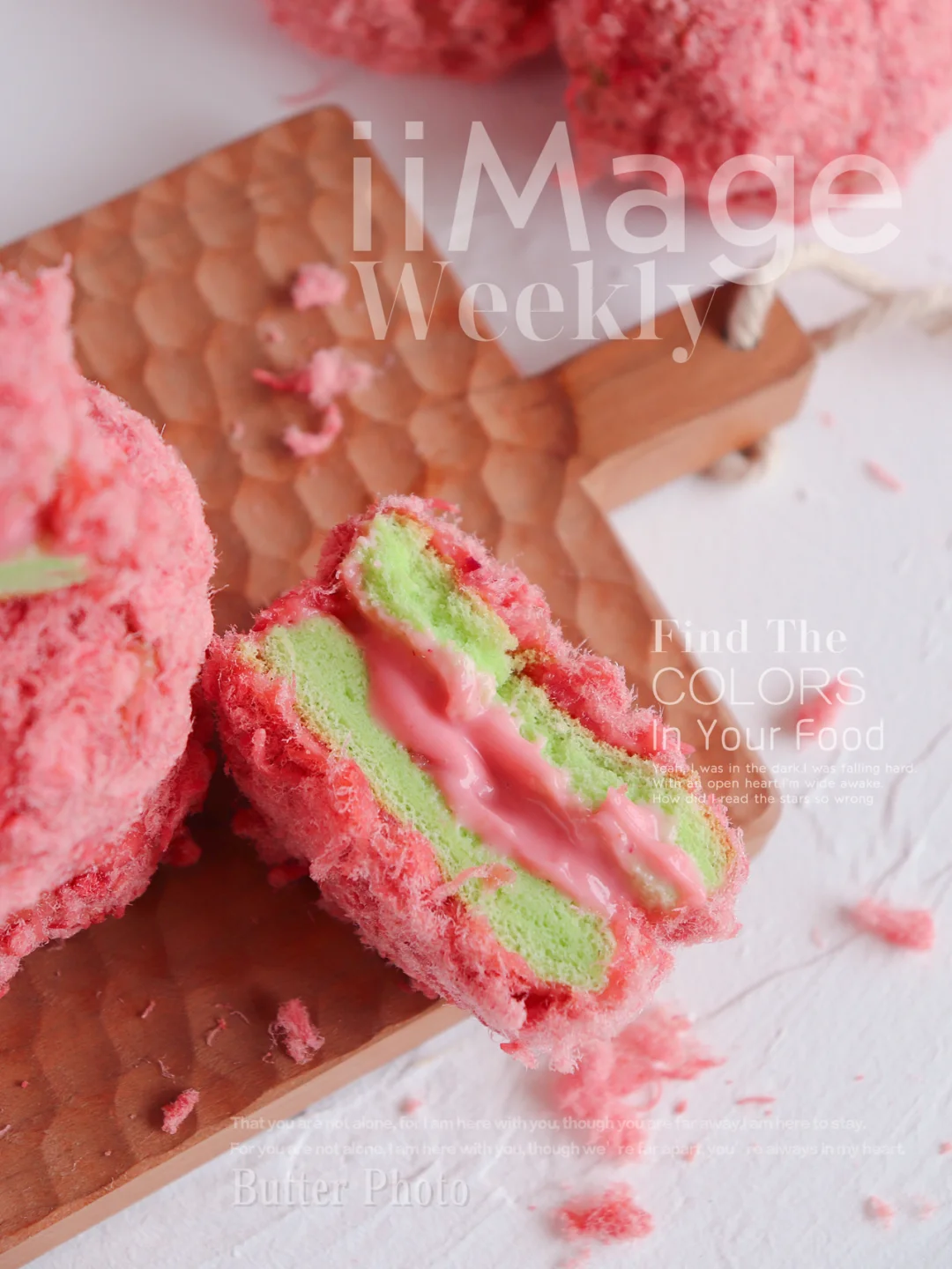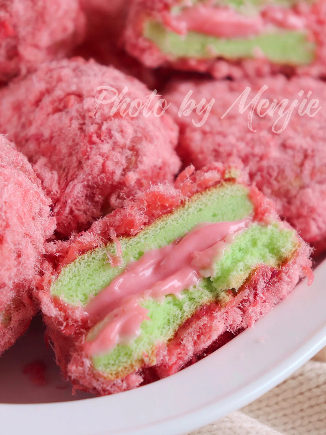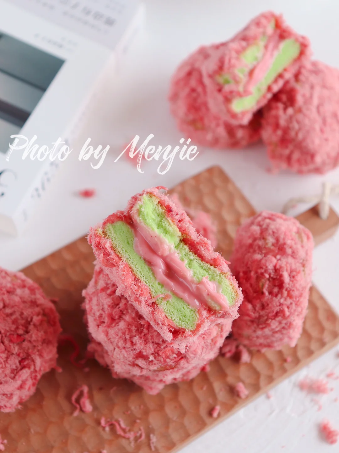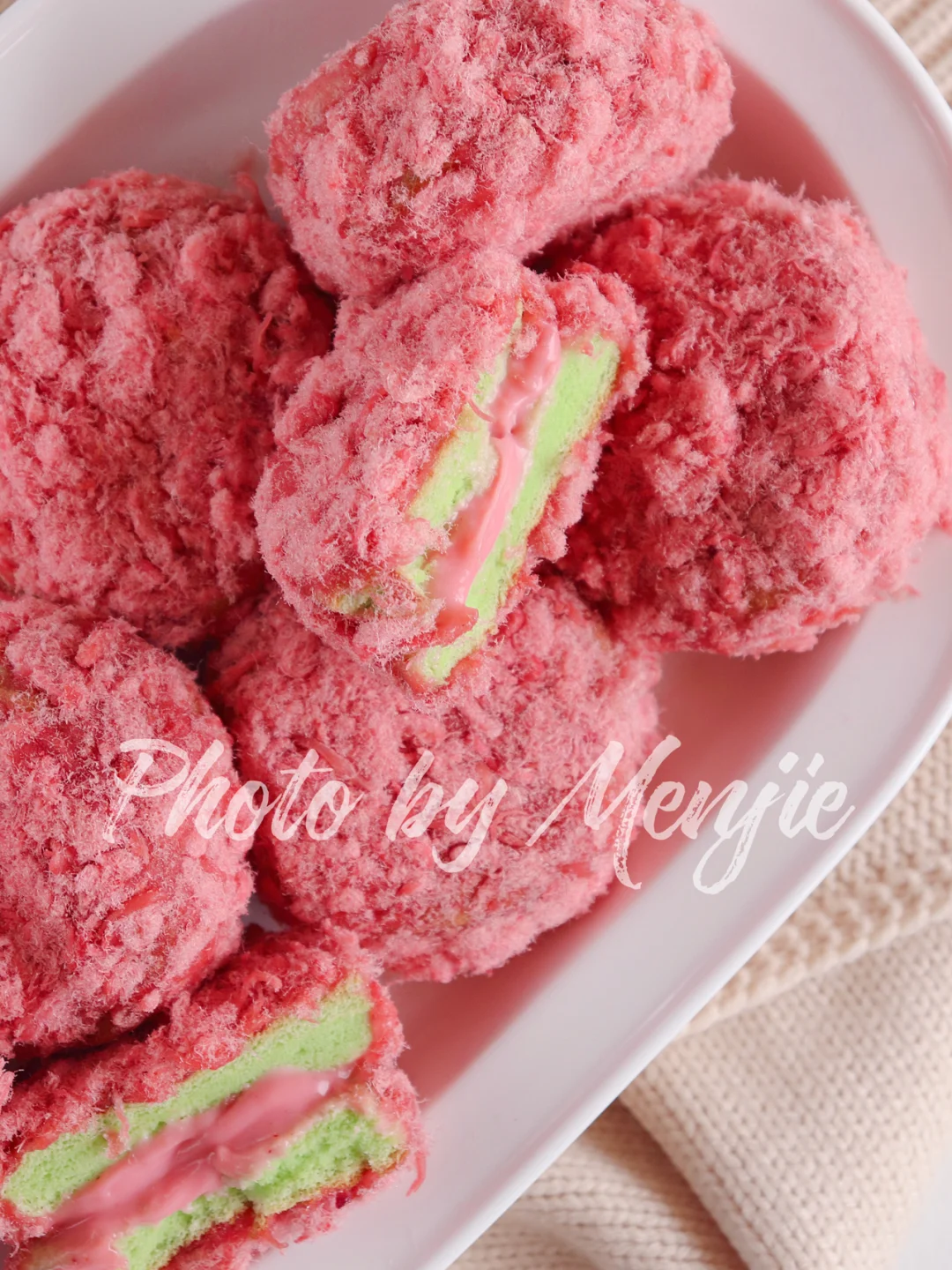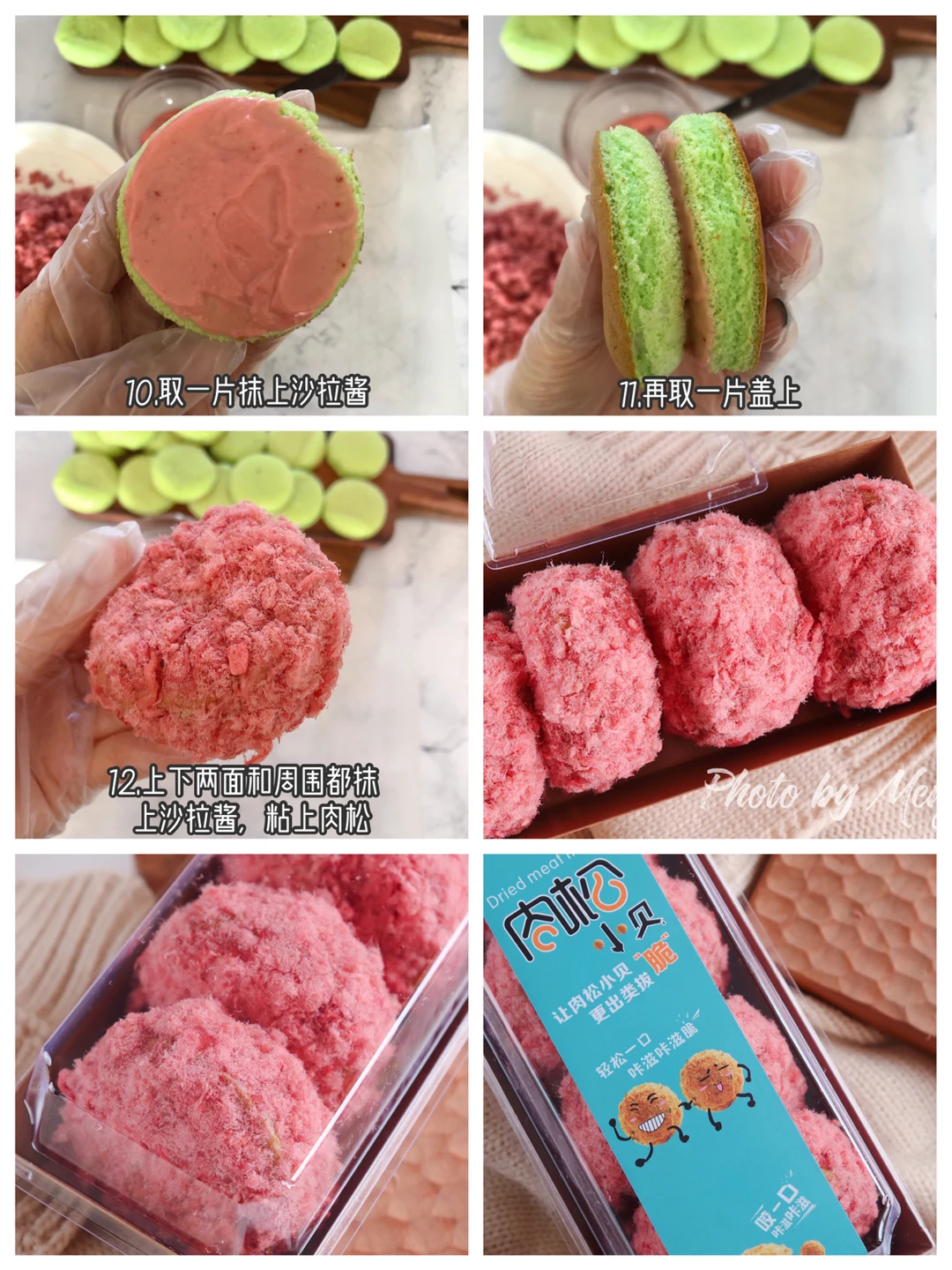 💚💖这两个小清新的颜色组合在一起有没有被美到[哇R]不仅颜值在线,味道和口感也是绝佳。绵软蓬松的蛋糕体上裹满了酥脆的肉松,酸甜的草莓沙拉酱配上斑斓的清香,吃起来一点都不会腻,反而有种清新的口感。好吃到停不下[色色R]