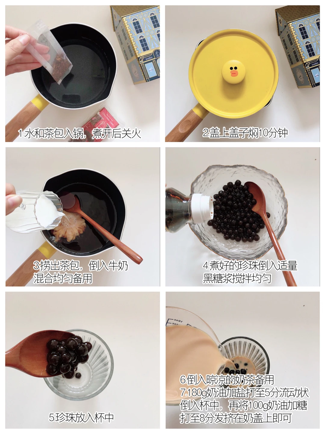 ❶茶包和水入锅煮开后,盖上盖子焖10分钟。取出茶包,倒入牛奶搅拌均匀备用。