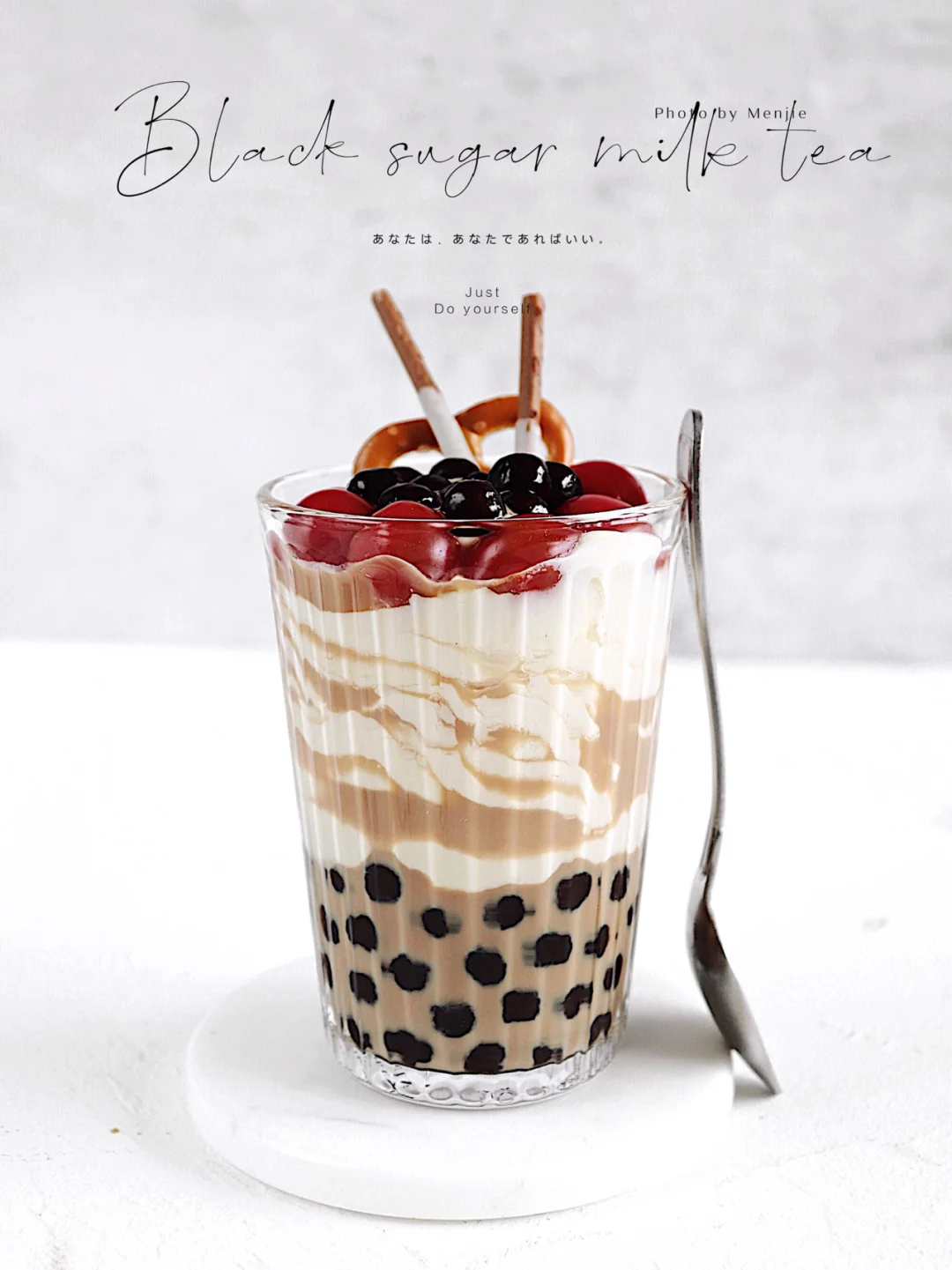 ❸淡奶油与细砂糖混合,先打至5分流动状。将珍珠放入杯中,倒入奶茶,再倒满奶油。