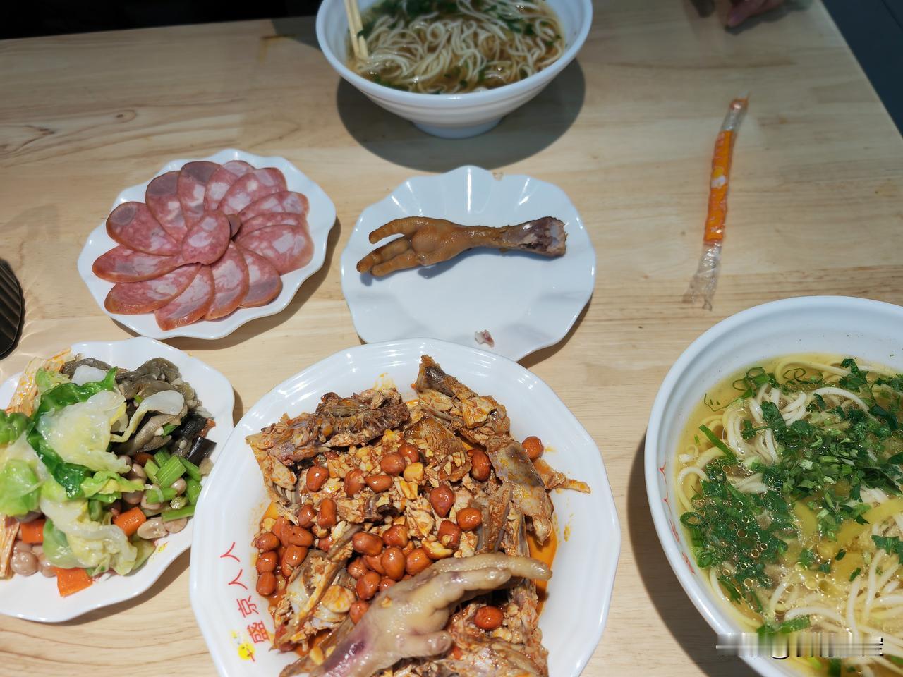 老四季和盛京人人,是鸡味抻面的泰山北斗,个人觉得还是喜欢老四季抻面和煮鸡架。 下图是我在盛京人人点的这些菜和面条。拌鸡架味道一般,熏鸡爪子还行,排骨肠挺好,小菜拼盘和抻面没有老四季的香。 你喜欢哪一家?