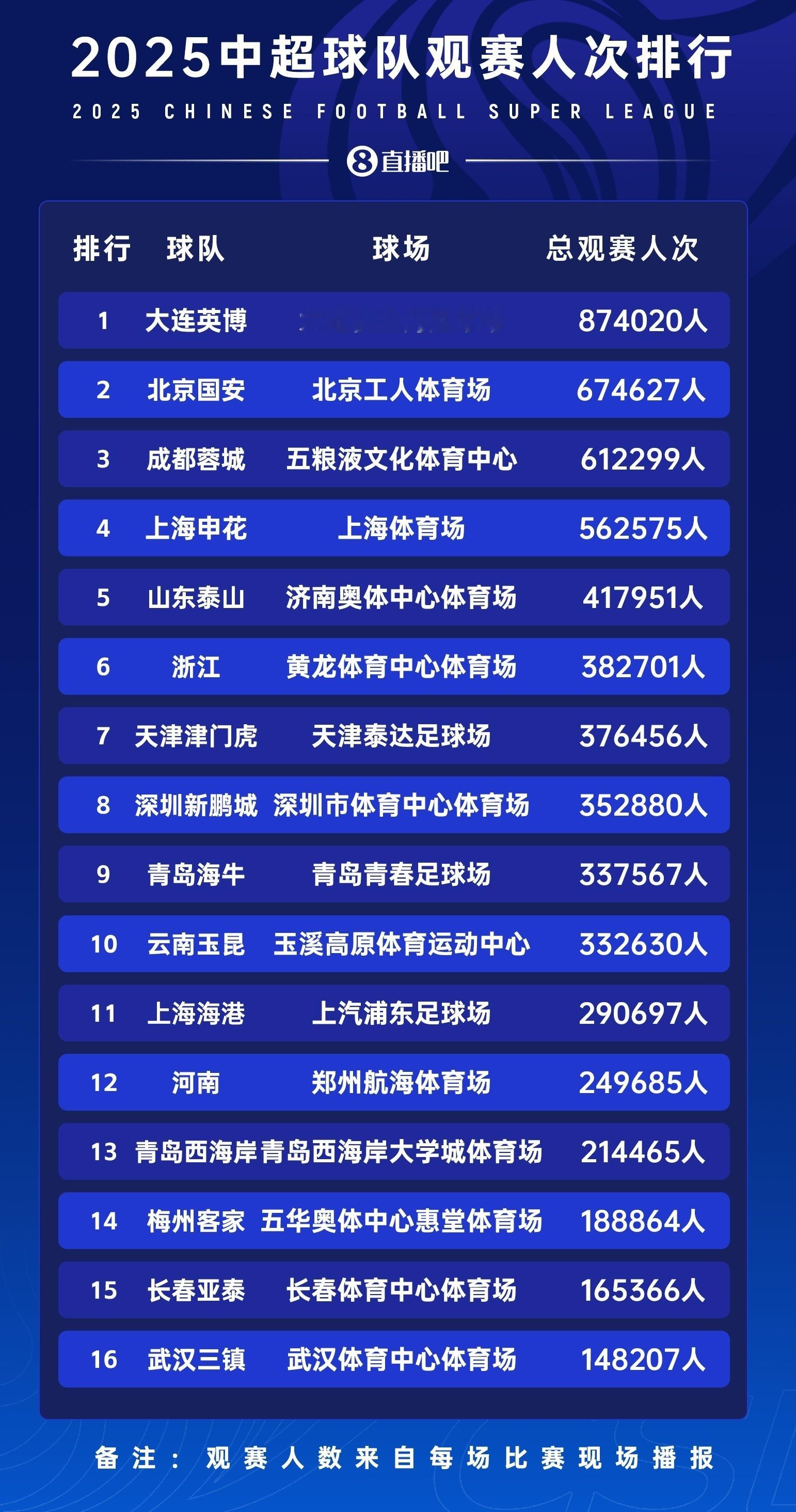 2025中超,总观赛人次是多少?16支球队的主场上座情况如何?2025赛季最热主场是哪里?最多上座比赛是哪场?