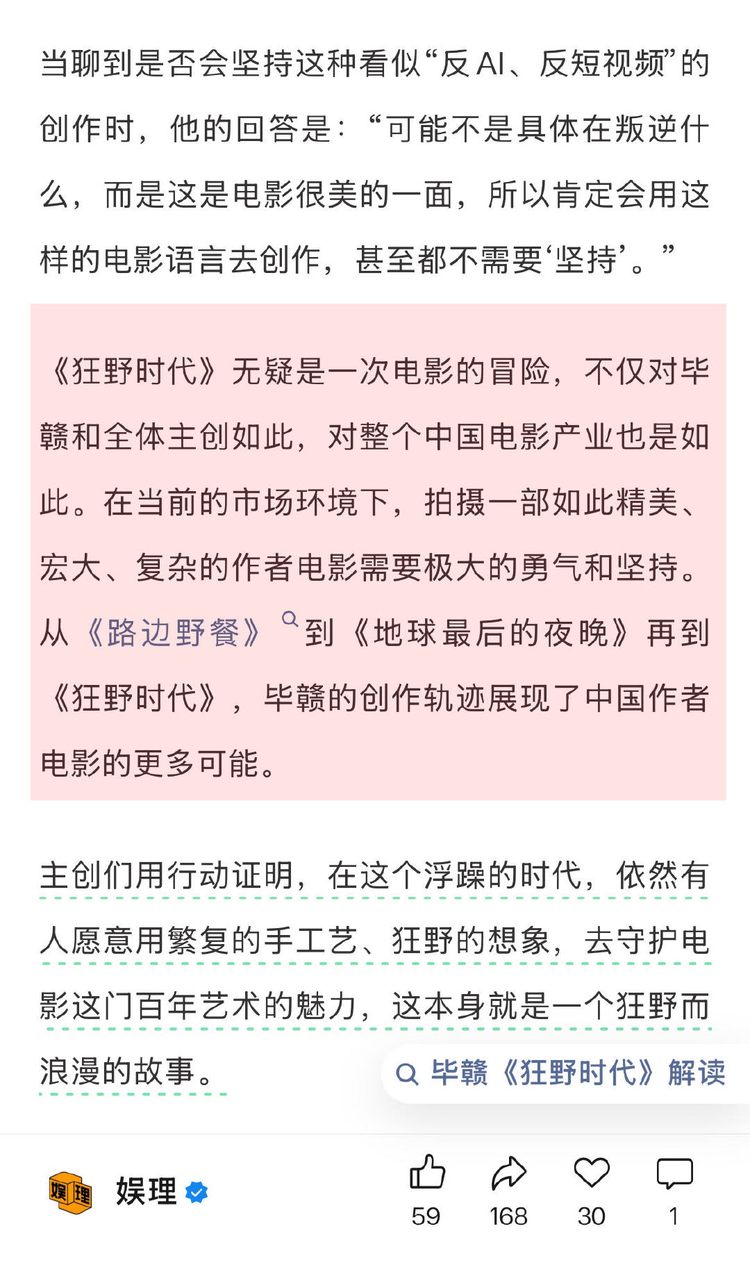 戛纳首映后,很多人说《狂野时代》是毕赣献给电影的一封情书。对此,毕赣有着更开放的理解。“它本身是关于电影的背景,是一个最好的概括…对于电影的未来很难讲,因为电影的未来不在唱不唱衰,全世界的电影都在发生波动,但这个波动到底是行业发生了变化,还是有什么本质上的原因,我也不知道。只觉得人对故事的理解和诉求在发生改变。”↓