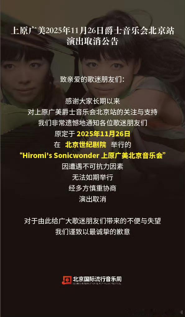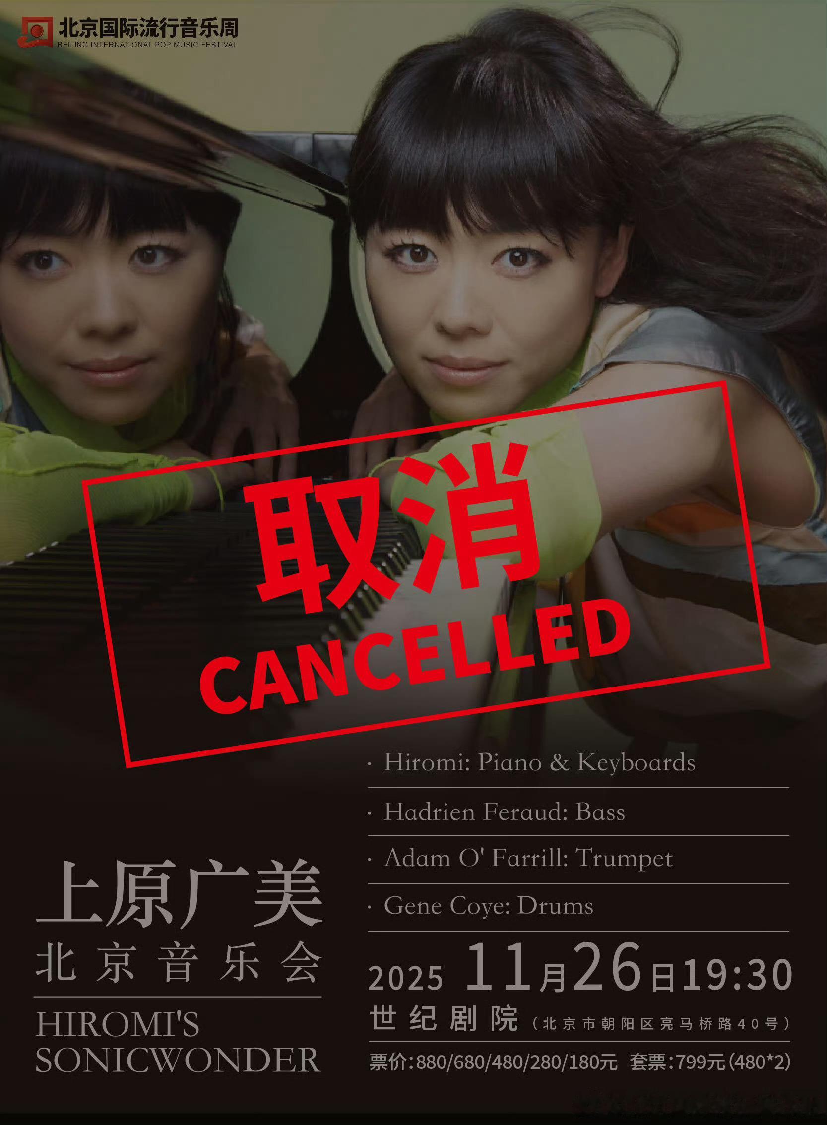 【】据 ,原定于2025年11月26日在北京世纪剧院举行的“Hiromi's Sonicwonder 上原广美爵士音乐会”因遭遇不可抗力因素,无法如期举行,经多方慎重协商,演出取消。该演出所有场次票品已作废,所有已售门票将通过原购票平台进行退票。