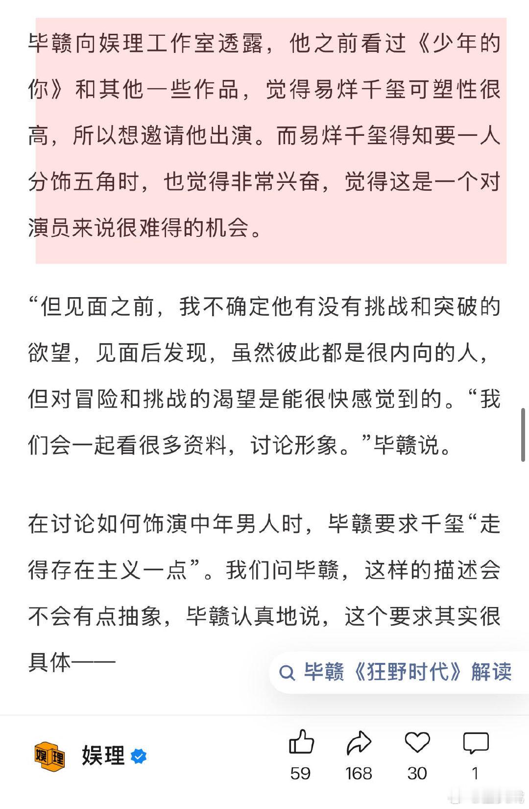 毕赣之前看过《少年的你》和其他一些作品,觉得易烊千玺可塑性很高,想邀请他出演。而易烊千玺得知要一人分饰五角时,也觉得非常兴奋,觉得这是一个对演员来说很难得的机会。“但见面之前,我不确定他有没有挑战和突破的欲望,见面后发现,虽然彼此都是很内向的人,但对冒险和挑战的渴望是能很快感觉到的…↓