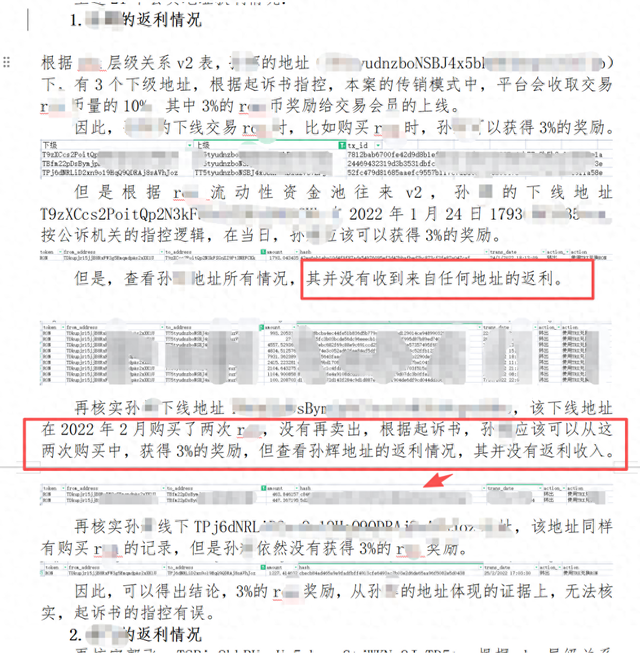 验证方法:调取控方提供的全部交易流水数据,针对每一个声称有下线行为的地址,核查其是否真的收到了来自下线交易的3%奖励,总共21个,曾杰律师团队,对这21个邀请了下线的地址,进行核实,在检方自己提供的基础数据中,找到了21个会员账号,他们分别推荐了哪些人。如果根据检方指控,这些被推荐的地址,如果有交易行为,上线地址就会收到3%的奖励。而且根据检方指控,这些都是在智能合约中确定的规则,因此,通过链上查询都能看到。但是检方并没有去做这个核实工作,因此,曾杰律师团队运用数据验证的的方法,将21个会员地址的所有下线交易都进行了核实。而3%的奖励为何重要,因为这就是传销的本质特征,是否存在返利。