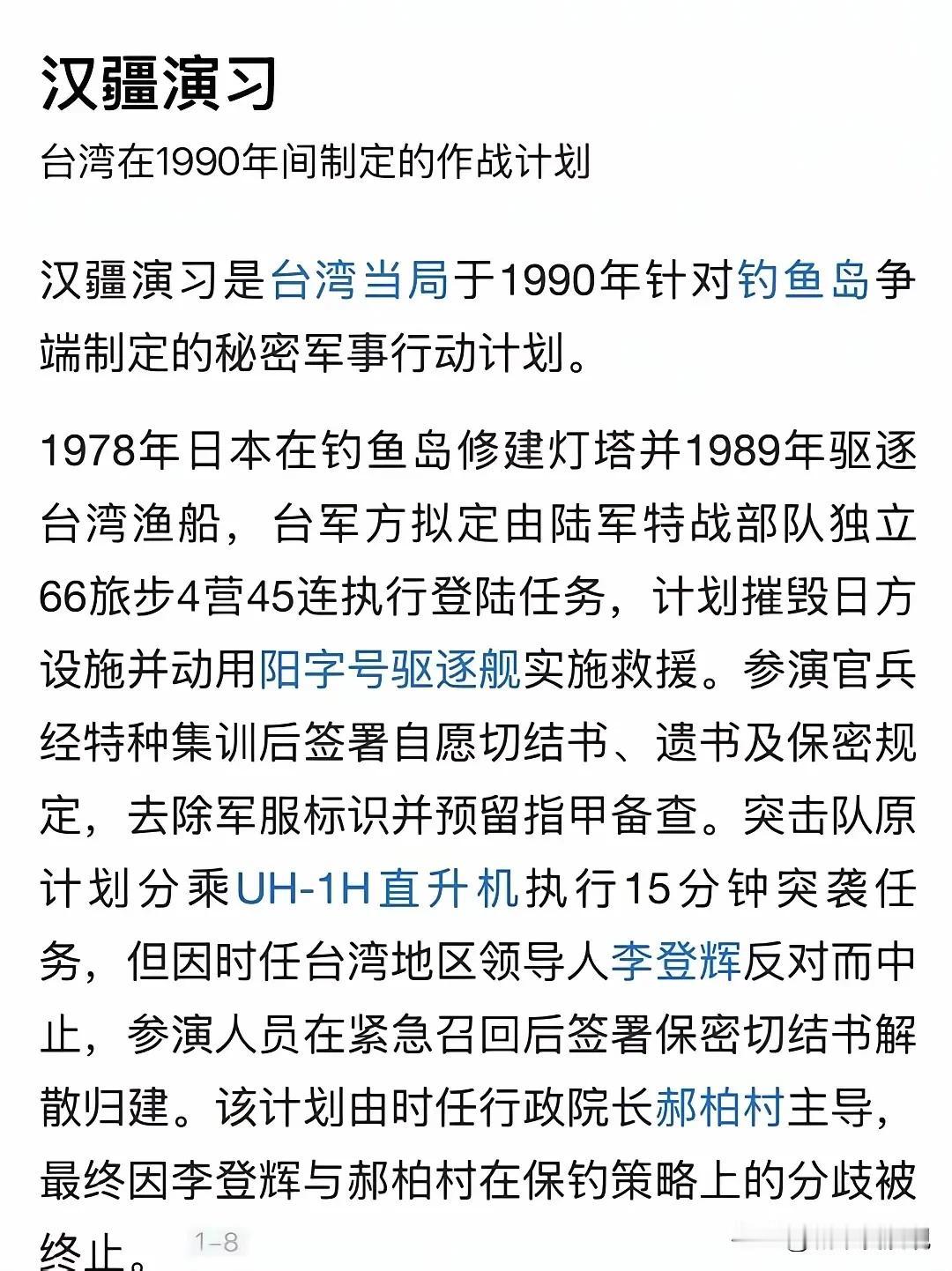 汉疆演习。这是90年代初台湾当局制定的以军事行动突袭拔除日本在钓鱼台上设置的非法设施,谋求收复保卫中国固有领土钓鱼岛的行动计划。也是让今天台湾当局无比汗颜的历史真相! 因为前一年,已经在钓鱼岛上修筑航标设施的日本开始派遣海警驱逐中国的渔民,俨然有将中国主权领土的钓鱼岛占为己有的野望。而台湾军界的大佬(台湾当局防务机构负责人),政界的二把手(台湾当局以行政机构负责人为文官之首,位次台湾当局领导人)郝伯村先生,不忍中华国土沦为异域。决心在钓鱼岛采取军事手段,以谋我中华海基永固。 当然,由于台湾当局国际影响力微弱,为避免直接军事冲突引起政治冲突,台湾当局还是将参战官兵的军籍全部革剥,以“志愿军”形式秘密参加收复钓鱼岛的战斗。然而,由于兹事体大,本次行动必然要获得台湾当局领导人的知晓与首肯才行。所以时任台湾地区领导人李登辉还是知晓了全情,但因为他自身的媚日立场,所以坚决反对郝柏村的“激进”行动。 虽然郝伯村站在中华民族统一的大义立场上,不断对李登辉晓之以情,动之以理,希望李登辉能够首肯,玉成此事。哪知李登辉态度强硬,坚决反对郝伯村的军事计划。为收复钓鱼岛而自甘切结为证,舍生忘死训练的国军兄弟们也泪流满面,扼腕叹息! 众所周知的是,郝伯村曾经对大陆立场强硬,犯下恶行。就在同年,发生了两次重大的渔船渔民死亡惨案,都与大权在握的郝伯村难逃干系。在台湾当局军警的残酷迫害之下,连续发生了闽平渔5540号,闽平渔5202”号渔船事件,两次死亡人数高达46人!这里我们不禁要发出灵魂的拷问:如果是台湾当局是正常执法,焉能如此?如果没有像郝伯村这种军政要员的密切授意,怎能致此! 郝伯村在惨案发生后的记者会上,在答记者问时更是轻松表示:“闽平渔5540号事件是意外事故,就好像飞机也会因故掉下来一样。”不到一个月后,闽平渔5202号又传出发生惨案的消息。郝柏村再次面对海内外的记者,还是淡定地进行狡辩:“闽平渔5202号大陆渔船是自己撞到军舰上的,因此我们不存在责任问题”。连续一个月发生意外,每次意外都无辜致死20多人,这都强言为意外事故,可见这些台湾当局的对陆顽固派实称无耻之尤! 而观览今日之台海,“媚日”的氛围在台湾当局的无情渲染之下愈加浓厚。虽然像郝伯村这种对大陆的顽固派日益增多,可是像郝伯村这样明确表示要以军事行动收复日占领土的人,已经绝无仅有了!瞻观前迹,不免后非。台海的现状更加令人唏嘘!