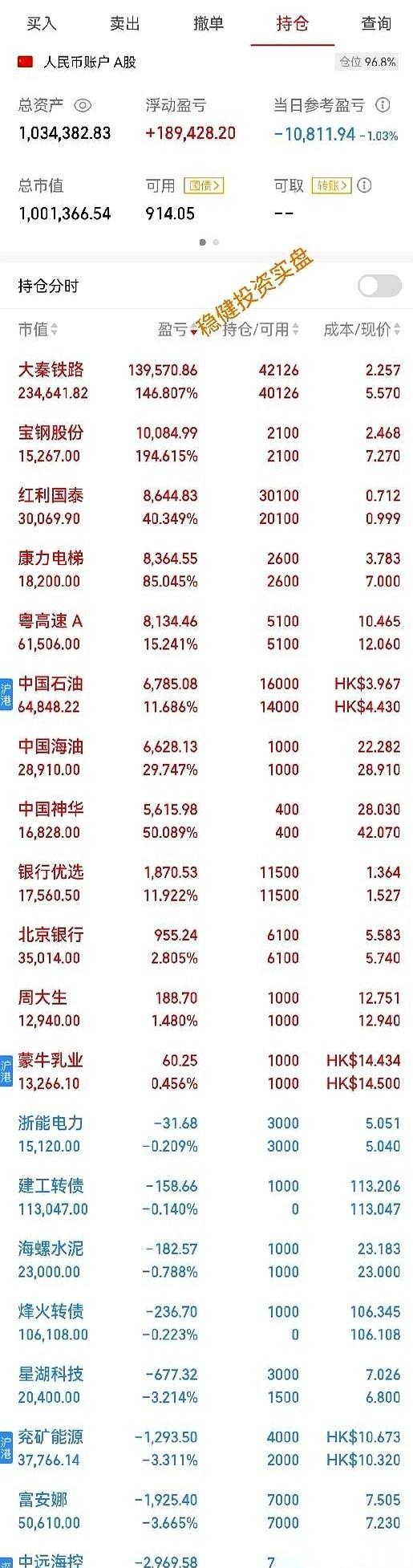 账户里躺着80万,今天干了件大事儿。 我把“中远海控”这艘大船,从A股的码头,悄悄开到了港股的码头。 为啥?不为别的,就为那边的股息更高。同一个公司,凭什么在那边每年就能多分几个钢镚儿?这笔账,得算明白。 我知道,今天大盘又绿得人心里发慌。 很多人估计又在骂骂咧咧地割肉,或者干脆把软件一删,眼不见为净。 而我呢? 还是老规矩,按原计划,把之前高点卖掉的那些筹码,一个个又笑眯眯地接了回来。 别人看我仓位,七成多,觉得我疯了。 他们不知道,我屁股底下还垫着一张几乎绝对安全的“救生筏”——那笔随时能抽出来的转债。 真到了山穷水尽,筏子一卖,子弹瞬间就又满了。 所以,我不慌。 而且我只加仓自己那几个知根知底的老伙计,从来不碰那些八字没一撇的新故事。剩下的现金,足够我陪这磨人的市场再耗上一段时间。 下跌,对有准备的人来说,从来不是风险。 是打折,是上车的机会。 别人恐惧我加仓,不是因为我头铁,是因为我的剧本,早就写好了。