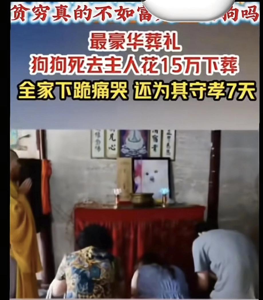 宠物狗死了,狗主人花15万为其下葬,全家下跪痛哭,并守孝7天。看了近日山东鱼台发出的一条视频,我心里五味杂陈,外加一句感叹,狗生幸福! 看完整个视频,狗子的葬礼太隆重了,设置了灵堂,有专业殡葬人员为其净身,美容,狗主人全家与其一一吻别,并下跪祭拜,哀乐声声,全家人痛哭流涕,并有专业抬棺人护送下葬,这规格就跟自己的爹娘去世差不多。 据说陪葬有几大箱牛奶,几大箱狗粮,几大包火腿肠,还有狗舍,狗衣和玩具,即使死后也衣食无忧。 不知这狗生前做了什么,死后能得到如此礼遇,真是不枉来这世上走一遭,如此幸福,应该会让不少人羡慕吧?