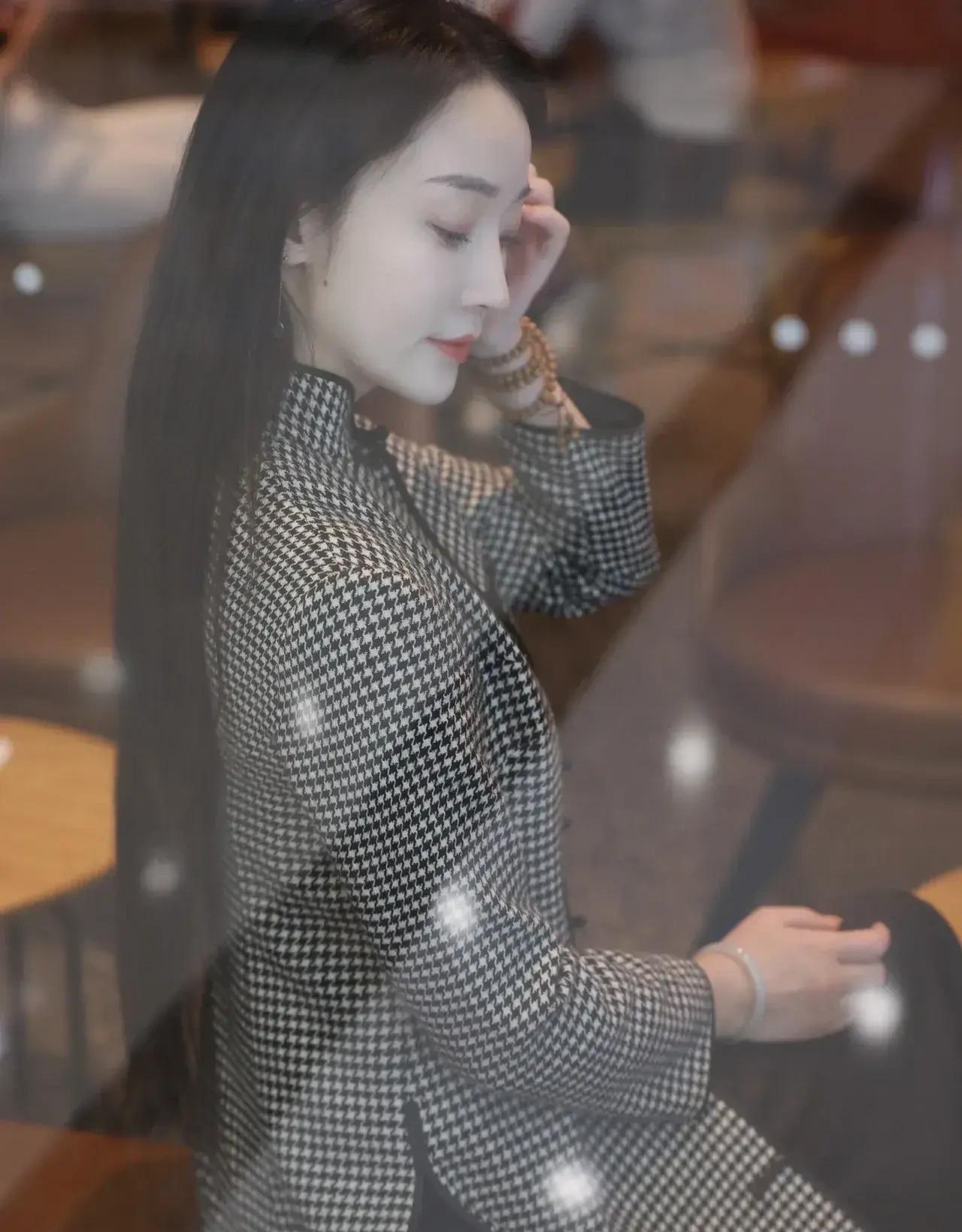 淡蓝针织如湖水漾开的涟漪,短发清爽衬得身姿雅致。她是湖畔的优雅精灵,把自然的清新