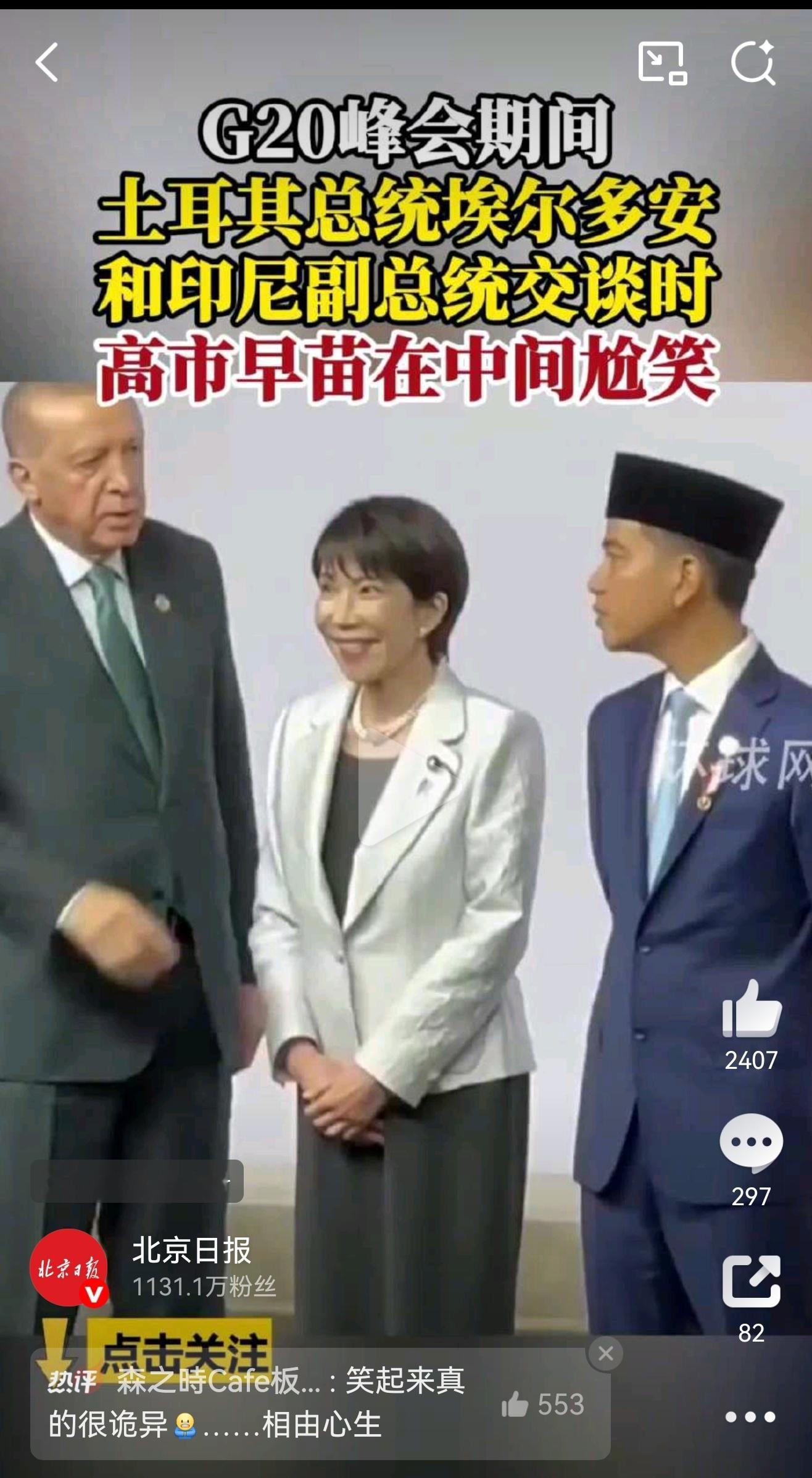 G20峰会合影期间,土耳其总统和印尼副总统交谈,高市早苗蹿到两人中间刷存在,插不上话,不停尬笑,活脱脱一小丑……