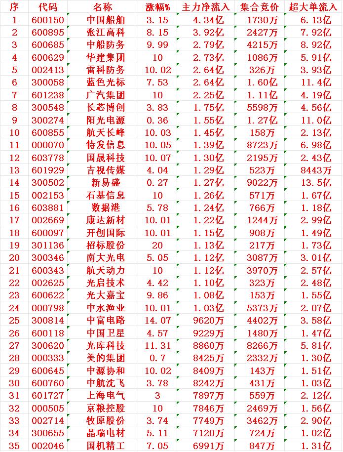 11月24日开盘45分钟,主力资金“买入的 ”的35名单一览! 中国船舶:净流入 4.34亿元 张江高科:净流入 3.92亿元 中船防务:净流入 2.79亿元 华建集团:净流入 2.73亿元 雷科防务:净流入 2.64亿元