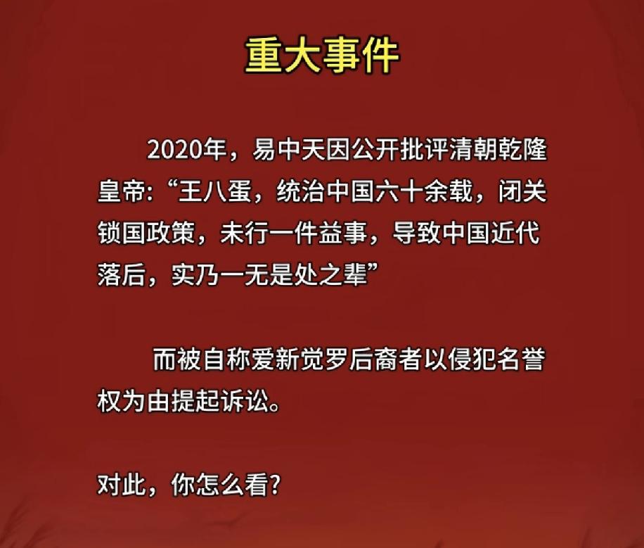 易中天2020年批乾隆,说乾隆统治60年,未行一件益事,但是乾隆皇帝十全武功,奠定了今日中华的版图啊!新疆为什么叫新疆,新的疆域,川边千年的土司,被乾隆打破,这些他就看不到了。历史是严谨的,当年初听他百家讲坛感觉说的头头是道,最后一细品,他是在结合历史书籍在臆想,历史人物能留下名字的哪有易于之辈。