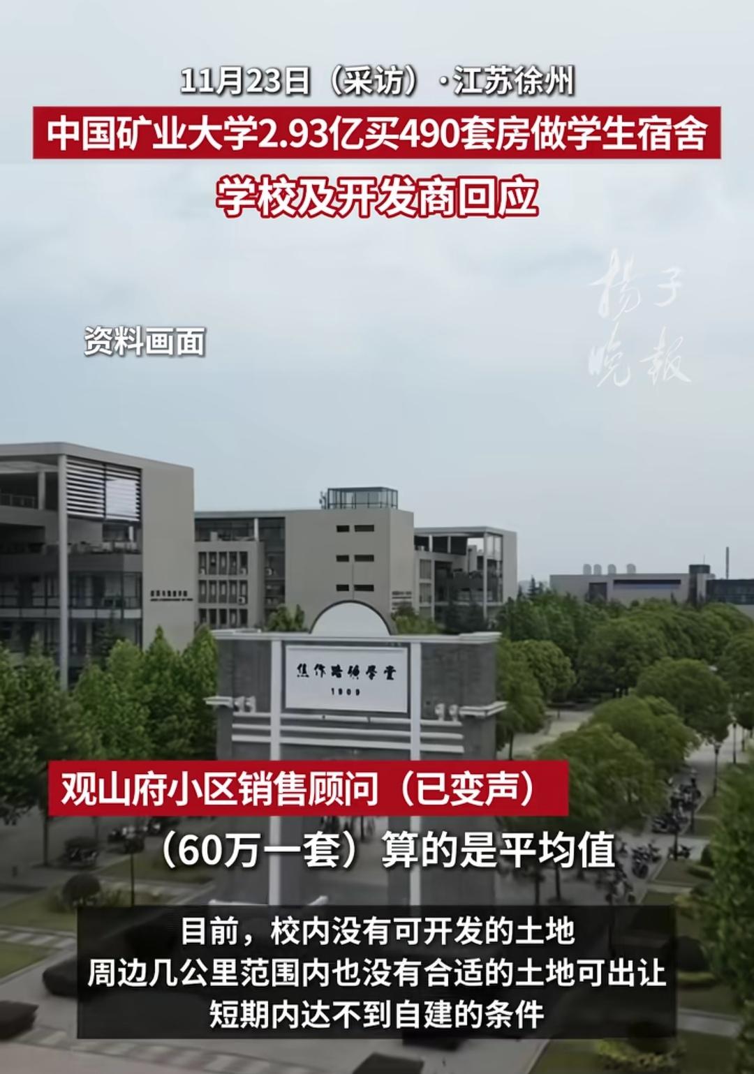 这个思路好,大学花3亿购置房产当学生宿舍。 (如图所示)在江苏徐州,中国矿业大学花费2.93亿购买490套住房作为学生宿舍,均价每套60万。这个思路好,一方面解决了房地产的库存,另一方面改善了学生居住条件,也算变相刺激了消费。现在国内是生产过剩,消费不足,与其补贴外国人,不如补贴给国人。