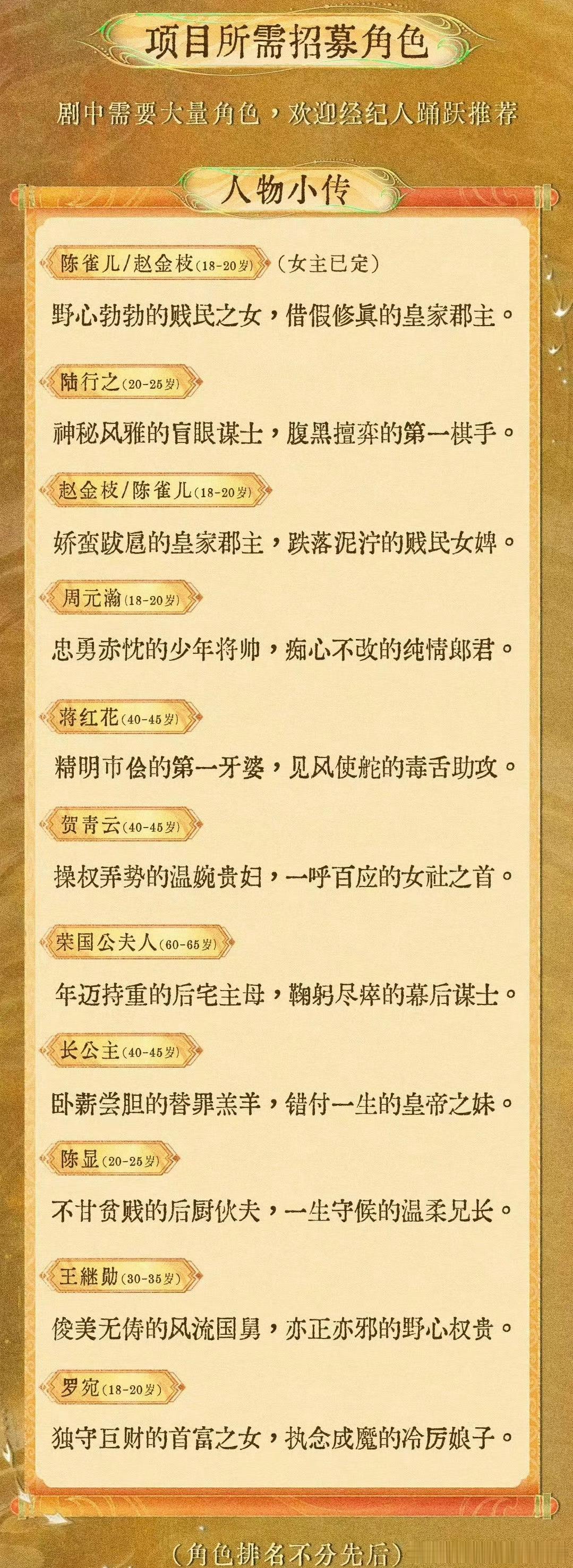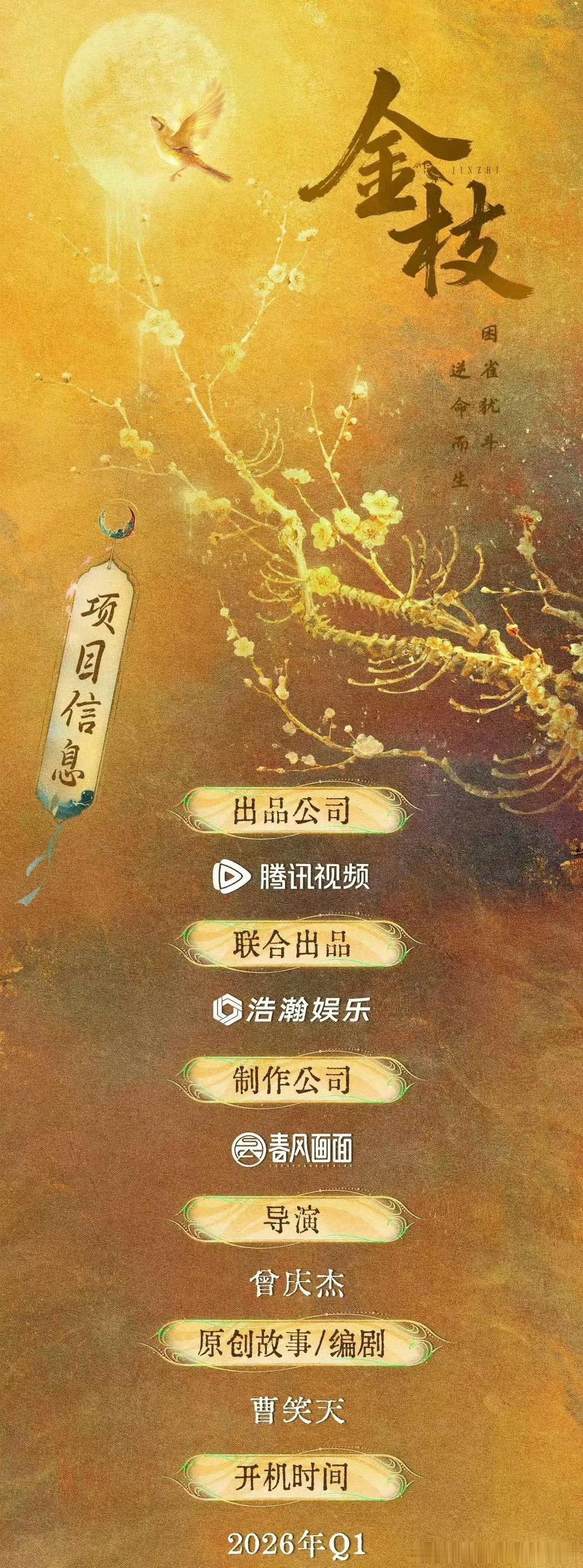 鹅古装剧《金枝》,预计明年Q1开机主演:李一桐、陈星旭、刘琳导演:曾庆杰 《九重紫》编剧:曹笑天 《九义人》