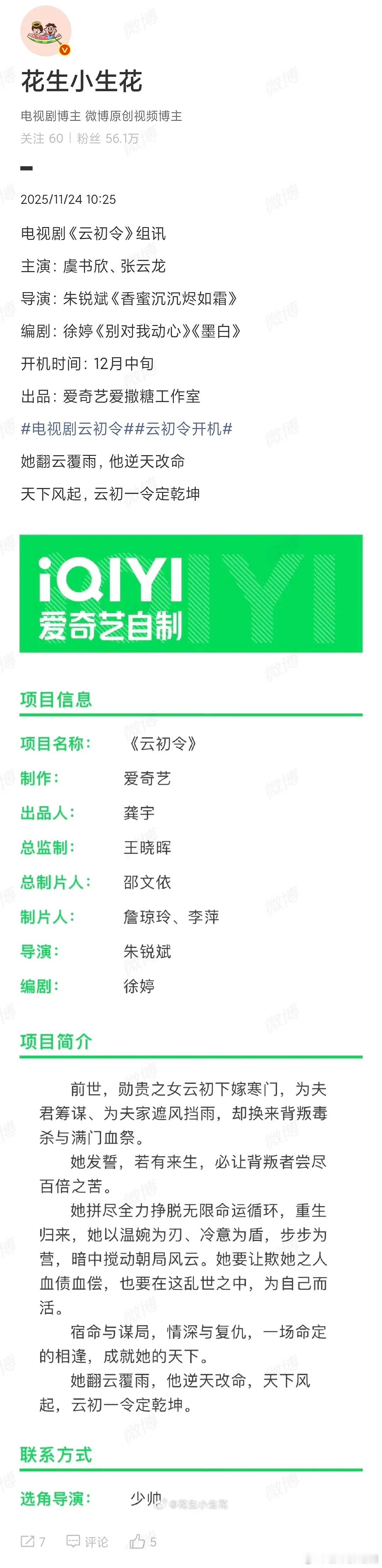 《云初令》组讯来了,宅斗题材,且女主将要挑战母亲这种角色,目前网传阵容是虞书欣、张云龙