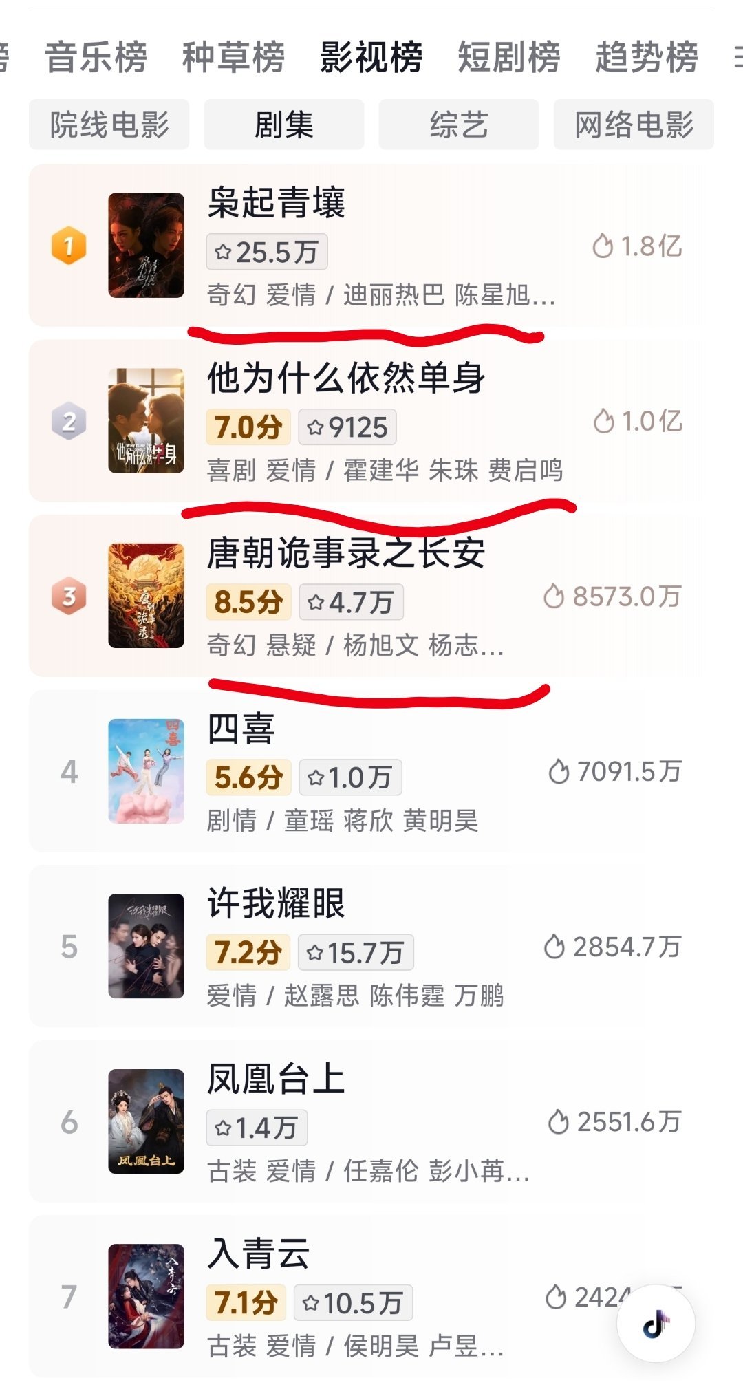 11.24,抖音剧集热度前三——❶迪丽热巴,陈星旭《枭起青壤》。❷霍建华,朱珠《他为什么依然单身》❸杨旭文,杨志刚《唐朝诡事录3》