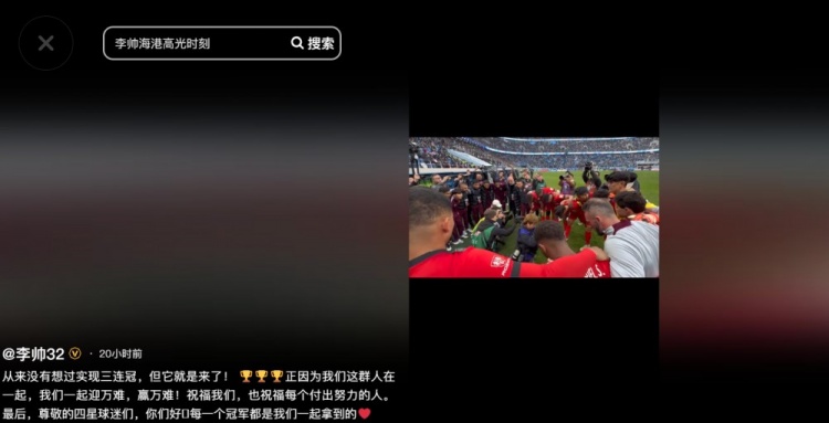 海港球员在个人社交媒体晒出视频,并写道:从来没有想过实现三连冠,但它就是来了!正因为我们这群人在一起,我们一起迎万难,赢万难!祝福我们,也祝福每个付出努力的人。最后,尊敬的四星球迷们,你们好,每一个冠军都是我们一起拿到的。