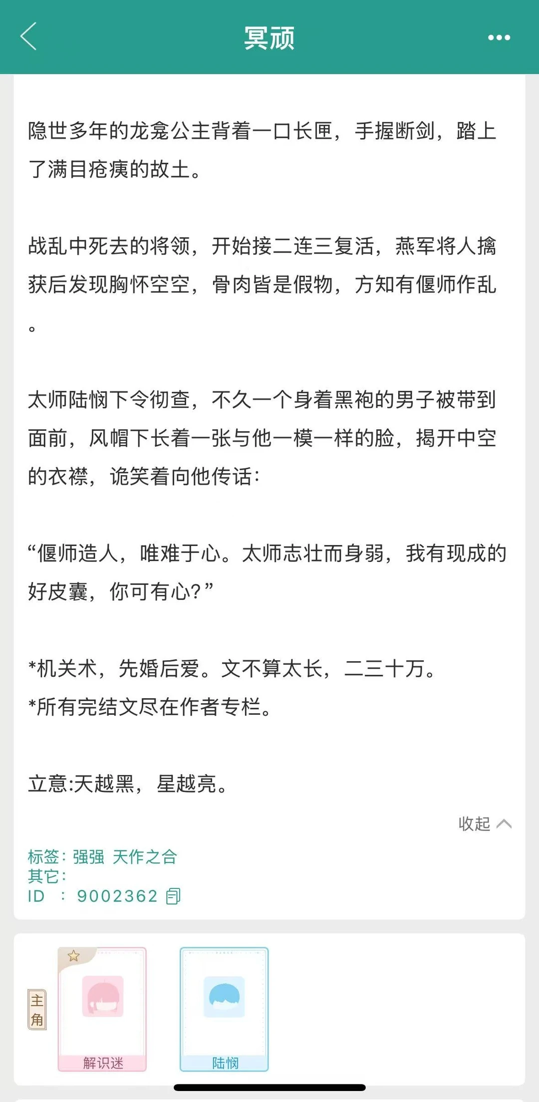 [种草R]故事设定新颖,情节张弛有度又草蛇灰线,以拉扯推动情感与成长,张力十足。女主作为亡国公主,以偃师的身份接近男主,意图完成复仇;男主权倾朝野,却身怀顽疾,需要借助女主的机关术进行续命。