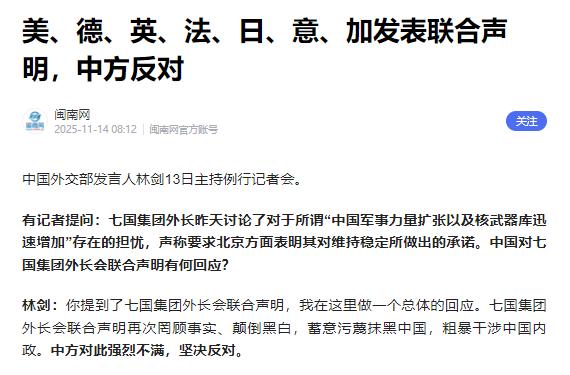 美国、德国、英国、法国、日本、意大利、加拿大发表联合声明,中国强烈反对。 这七个老牌强国凑一块儿开了两天会,全球多少要紧事等着他们拿主意,粮食危机饿肚子的人还没吃饱,能源价格涨得普通家庭都快用不起电,疫情留下的烂摊子也没收拾干净。 可他们倒好,这些正经事一句没多谈,一门心思攒出份针对中国的联合声明,合着他们眼里就没有全球老百姓的死活,只盯着怎么给中国使绊子。 这七个国家组成的G7,说起来也有些年头了,上世纪七十年代就成立了,一开始说是为了协调经济政策应付危机,可越往后越变味,成了西方强国抱团维护自己特权的小圈子。 以前他们针对苏联,后来又拉过俄罗斯,现在眼看中国发展起来,就把矛头全对准了咱们,这次开会更是明火执仗,声明里一会儿说要给中国划 “红线”,一会儿又炒作 “中国威胁”,说白了就是看不得中国好,想联手把咱们的发展势头压下去。 更让人不舒坦的是参会的阵仗,欧盟的代表从头坐到尾,等于整个西方阵营都拧成一股绳针对咱们,还有不少新兴经济体的外长也被请去了。 按说这些新兴国家跟咱们一样,都是从穷日子过来的,应该更懂发展的不容易,可在涉华议题上居然跟 G7 保持一致。 这里面的门道不用细想也清楚,要么是被西方用利益收买了,要么是被他们的霸权气势压得不敢说真话,所谓的 “一致立场”,根本不是什么共同理念,就是西方强国搞的霸权主义表演,想靠着人多势众显得自己有理。 他们现在天天把中国挂在嘴边,核心就是怕自己的好日子到头了,过去几十年,这些发达国家的好日子是怎么来的?说白了就是靠剥削全球的资源和劳动力。 他们把高污染、低工资的产业转移到发展中国家,用廉价的原材料和劳动力造出产品,再以高价卖回去,这样的不平等交换让他们赚得盆满钵满。 中国一开始也承接过这些产业,但咱们没甘心一直当别人的加工厂,而是一步步搞技术升级,工人的工资也跟着涨了起来,这就断了西方企业的暴利路,他们没法再像以前那样轻松赚黑心钱,自然就把账算到了中国头上。 更让他们坐不住的是中国的技术突破,以前这些国家把技术当成垄断的宝贝,拿着芯片、高端制造这些东西卡别人脖子,别的国家想发展只能求着他们,花大价钱买二手技术。 可中国偏不信这个邪,硬是靠自己的努力搞出了名堂,现在有了世界上最大的高铁网络,商用飞机也能自己造,新能源汽车和光伏技术更是走在了世界前面,这些以前被西方当成 “专属品” 的成就,咱们中国都实现了,这就直接打破了他们的技术垄断。 以前他们能用技术换别人的廉价资源,现在中国能给其他发展中国家提供更实惠的技术选择,西方的如意算盘彻底被打乱了。 他们炒作 “中国威胁”,纯粹是颠倒黑白,中国从来没像他们那样搞殖民掠夺,也没像他们那样在全球到处挑起战争,咱们的发展都是靠自己一砖一瓦干出来的。 可这些发达国家习惯了高人一等,见不得曾经的 “落后国家” 赶上自己,更怕自己在全球的话语权被稀释,以前他们说一不二,现在中国在国际上说话越来越有分量,很多发展中国家愿意跟咱们合作,他们就觉得自己的霸权地位受到了威胁,急着跳出来搞针对。 这种抱团找茬的做法,其实暴露了他们的虚弱,现在的世界早就不是西方说了算的时代了,G7占全球经济的比重越来越低,他们内部也矛盾重重,美国跟欧洲在贸易上吵过架,日本和韩国的半导体竞争也没停过,可一到针对中国的问题上就立刻 “团结”,这种选择性团结恰恰说明他们没别的办法,只能靠联手施压。 中国强烈反对是完全应该的,咱们不惹事但也绝不怕事,他们的联合声明看着吓人,其实没多少实际分量,真要动起手来,他们自己的利益也会受损。 中国现在是很多国家的最大贸易伙伴,他们的企业在中国有巨大的市场,真要是搞对抗,他们的资本家第一个不答应。 这些发达国家要是真有本事,就该把心思用在解决自己的问题上,别总想着打压别人,他们的经济增长乏力、贫富差距拉大,这些都不是中国造成的,而是自己的发展模式出了问题。 与其花两天时间凑联合声明针对中国,不如好好想想怎么给本国老百姓涨工资、怎么解决能源危机,再这么抱着霸权思维不放,最后只会被世界发展的潮流甩在后面,到时候哭都来不及。