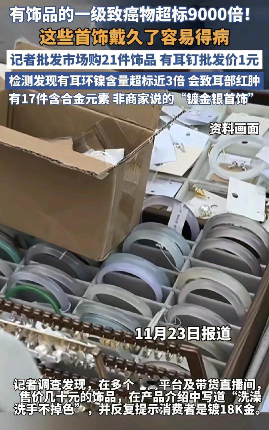 在广州,义乌等等的饰品批发市场有很多这种打着是s925银或者是18k金的饰品,价格也从十几元到几十元不等,批发价低至一元起。不过最近被曝光出这些视频,有的质量并不合格,甚至是致癌物超标了几千倍。有的写着s925银,但经过检测之后发现是跟银丝毫没有任何的关系。人们戴久以后还会出现皮肤过敏,脱皮等等的现象,身体久而久之就会出现毛病。