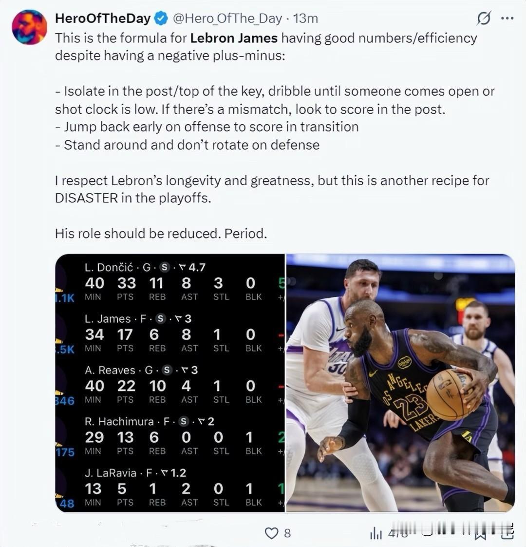 詹姆斯关键防守被顶飞,湖人险遭弱旅爵士绝杀。 詹姆斯全场上场34分钟,18投8中,三分球4中0,砍下17分6篮板8助攻2失误2犯规,正负值全队最差-14。 赛后,美媒痛批詹姆斯:“詹姆斯基础数据似乎总是不错,但他的正负值根本没法看。勒布朗喜欢粘球,又总是漏防,季后赛将是球队的灾难。” 本场最后一防,詹姆斯直接被马尔卡宁顶飞,如果不是马尔卡宁自己手软投失罚球线绝杀球,湖人今天将被曝冷。