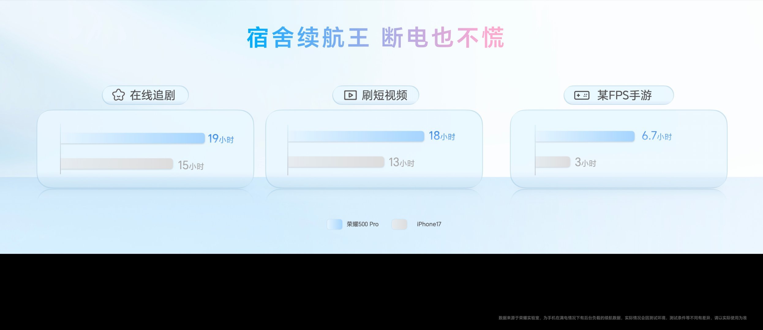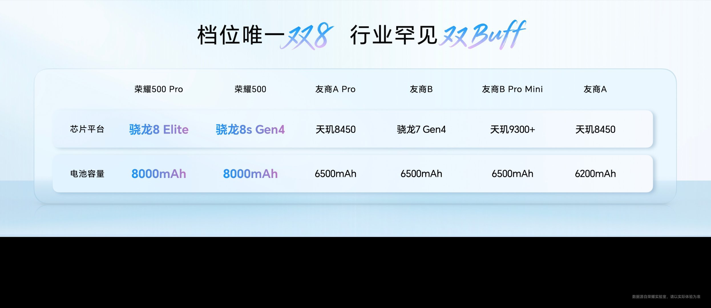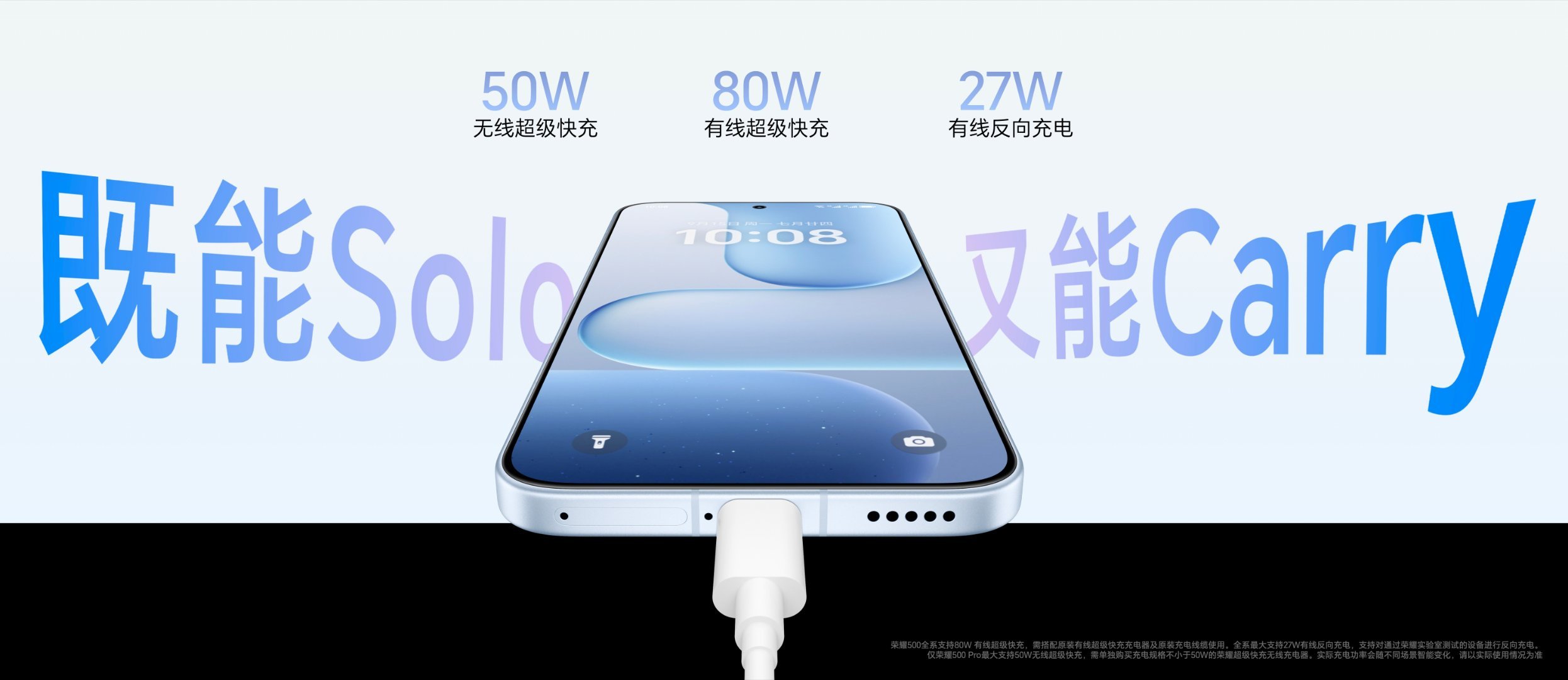 荣耀 500 全系搭载 8000mAh 青海湖电池(含硅量 15%,能量密度 915Wh/L),HONOR E2 能效增强芯片,都江堰 AI 电源管理系统,80W 有线快充,荣耀500Pro 独占 50W 无线快充,全系 27W 有线反向充电。