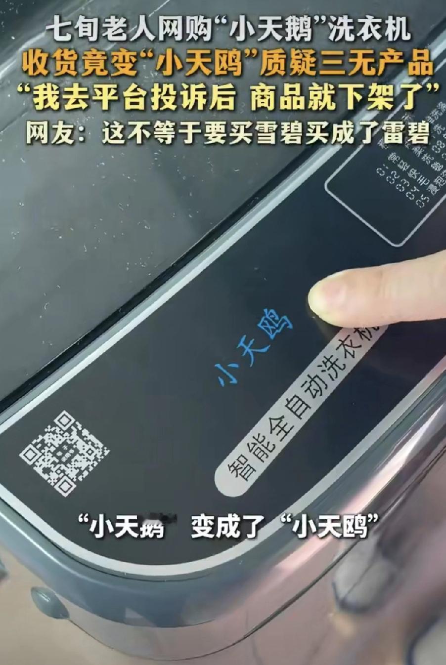 老人网购小天鹅洗衣机,竟收到“小天鸥”! 价格实惠的背后,可能藏着你不知道的陷阱。 近日,长沙的黄女士遇到了一件烦心事:她在某网络平台花405元买了一台“小天鹅”洗衣机,满心期待地等收货,结果拆开一看傻眼了——“小天鹅”竟然变成了“小天鸥”!再仔细一看,机器外观粗糙,看起来破旧不堪。 黄女士怀疑这台“小天鸥”洗衣机是三无产品,想联系商家或厂家理论,却发现根本找不到他们。 她只好向购物平台投诉,结果平台的处理方式只是下架该商品。问题没解决,商家却可能换个“马甲”继续经营。 小天鹅品牌官方直播间的主播明确表示,小天鹅品牌根本不存在“小天鸥”产品。 山寨名牌何时休? 这并非个例。之前就有媒体曝光过,一些超市里销售的小天鹅电热水壶、电饭煲等小家电,实际上都是涉嫌商标侵权的山寨产品。 无锡小天鹅干衣机有限公司、无锡小天鹅小家电有限公司……这些听起来像是正规厂家的名字,其实都在打着“小天鹅”的擦边球。 网购如何避坑? · 价格过低要警惕:正品小天鹅洗衣机405元几乎不可能买到,遇到价格低得离谱的商品,一定要多留个心眼。 · 仔细核对品牌名:山寨产品往往在品牌名上玩文字游戏,比如“小夭鹅”、“小攸鹅”等,购买时务必看仔细。 · 选择官方渠道:尽量选择品牌官方旗舰店或信誉良好的商家,并查看店铺评分和用户评价。 · 保留购物凭证:下单时记得索要发票或电子凭证,以便发生纠纷时有据可依。 黄女士的遭遇提醒我们,网购时一定要擦亮眼睛,别被“低价”和“名牌”蒙蔽了双眼。你有过类似的购物经历吗?欢迎在评论区分享!