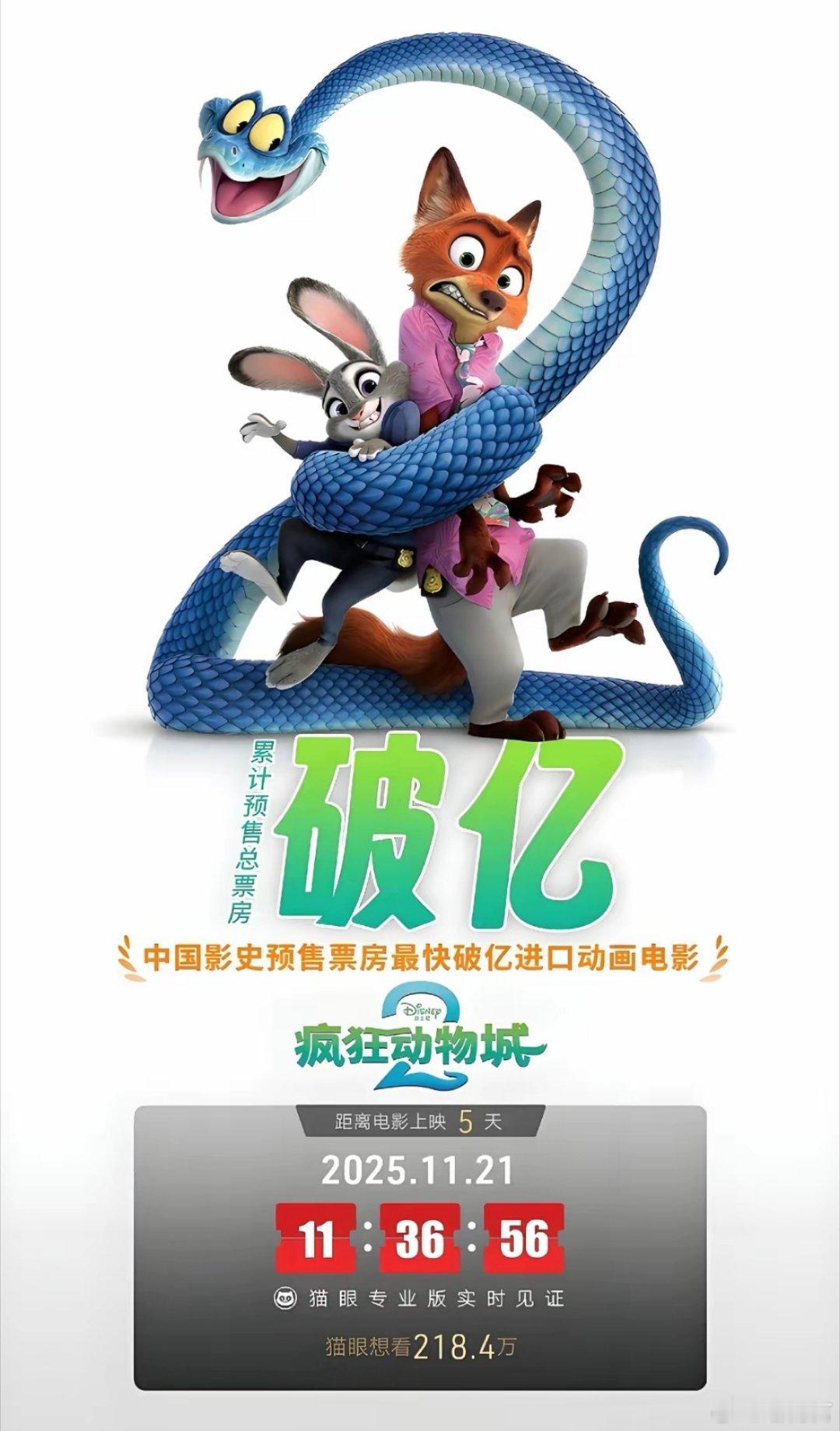 《疯狂动物城2》截至11月21日累计预售票房(含零点场)突破1亿元,成为中国影史预售票房最快破亿的进口动画电影12。该片由迪士尼制作,前作《疯狂动物城》曾以15.3亿元票房创下中国进口动画电影纪录5,续作将于11月26日在中国内地和北美同步上映5。