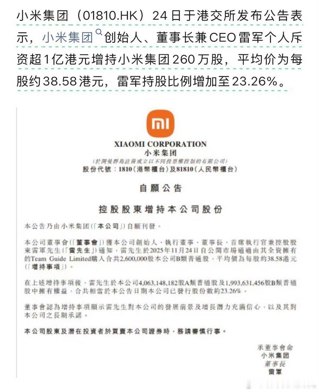 11月24日,小米集团发布公告,小米集团创始人、董事长兼CEO雷军个人斥资超1亿港元增持小米集团260万股,平均价为每股约38.58港元,雷军持股比例增加至23.26%。