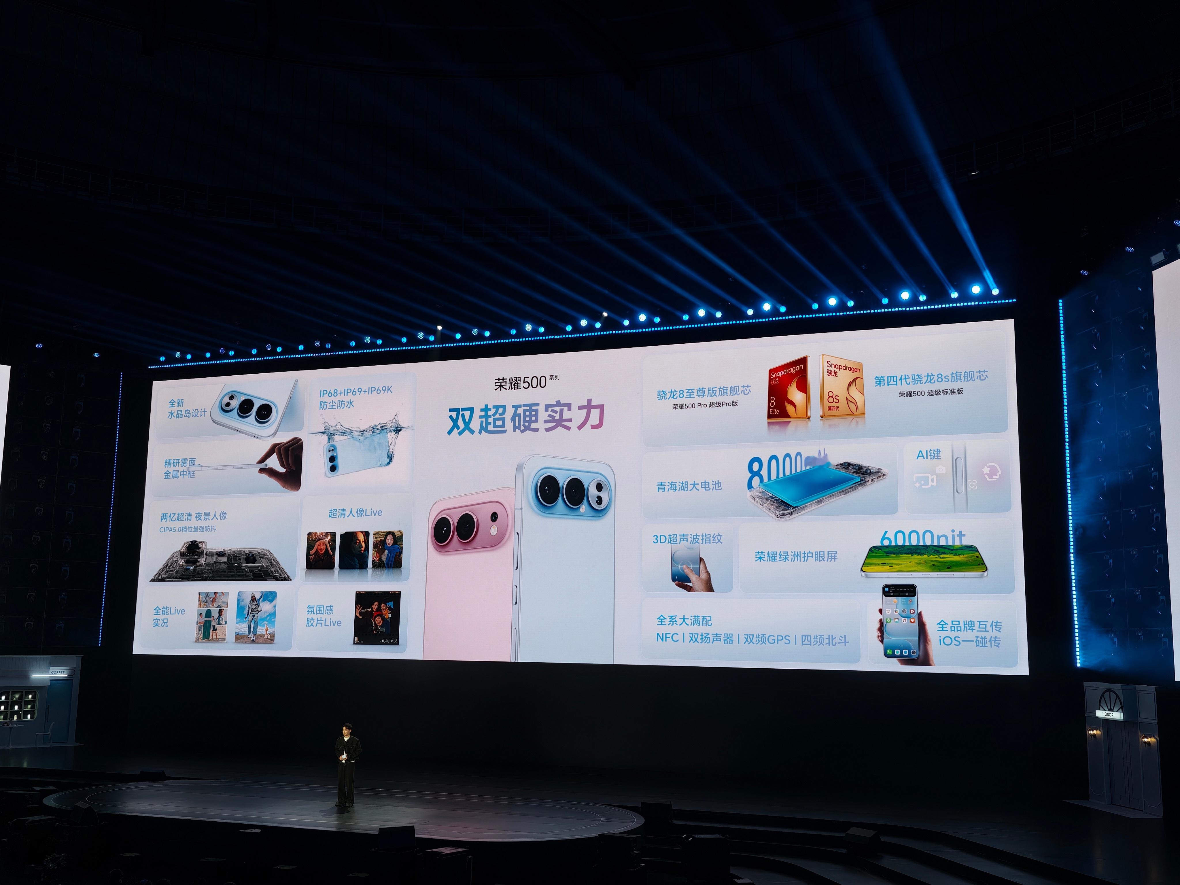 全系搭载骁龙8系芯片,超级标准版搭载骁龙8s Gen4芯片,超级Pro版搭载骁龙8至尊版。全系搭载8000mAh青海湖大电池,并搭载旗舰同款HONOR E2能效增强芯片及都江堰AI电源管理系统,支持80W有线超级快充,Pro搭载50W无线超级快充。全系搭载绿洲护眼屏,支持包括照明闪烁检测、AI视觉健康管理、AI动态离焦等九大荣耀绿洲护眼特性。