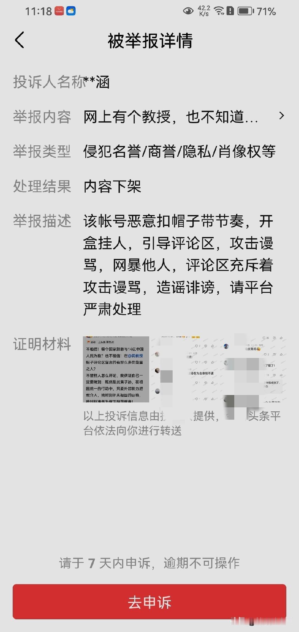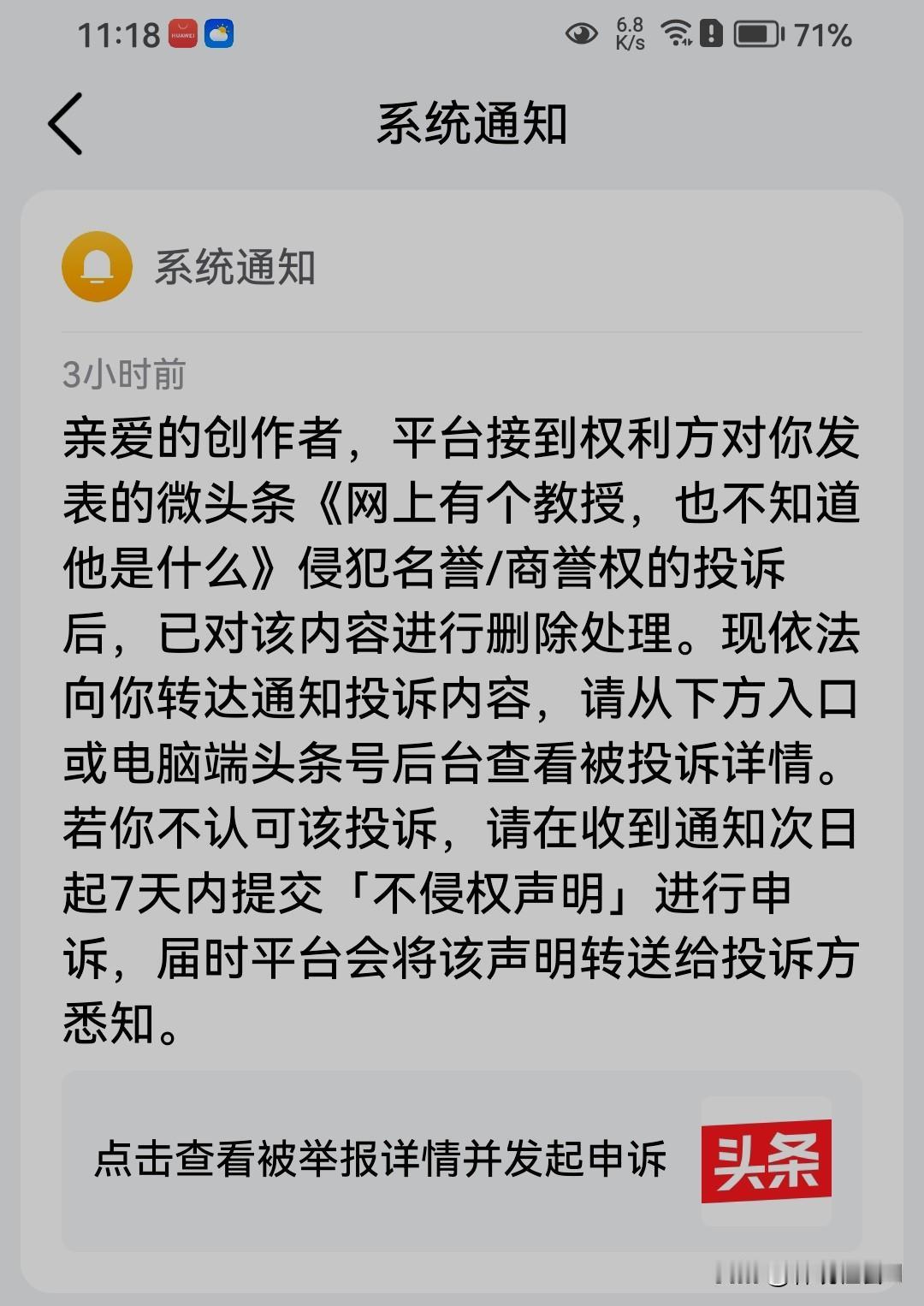 真荣幸啊!又被教授投诉了,这一次他的投诉成功了,平台把作品做了下架处理! 按道理说,网络平台是百家争鸣,百花齐放,畅所欲言的地方,不知道那位教授为什么动不动喜欢投诉别人呢? 心有多大,舞台就有多大,像这样心胸狭隘的人能走远吗?