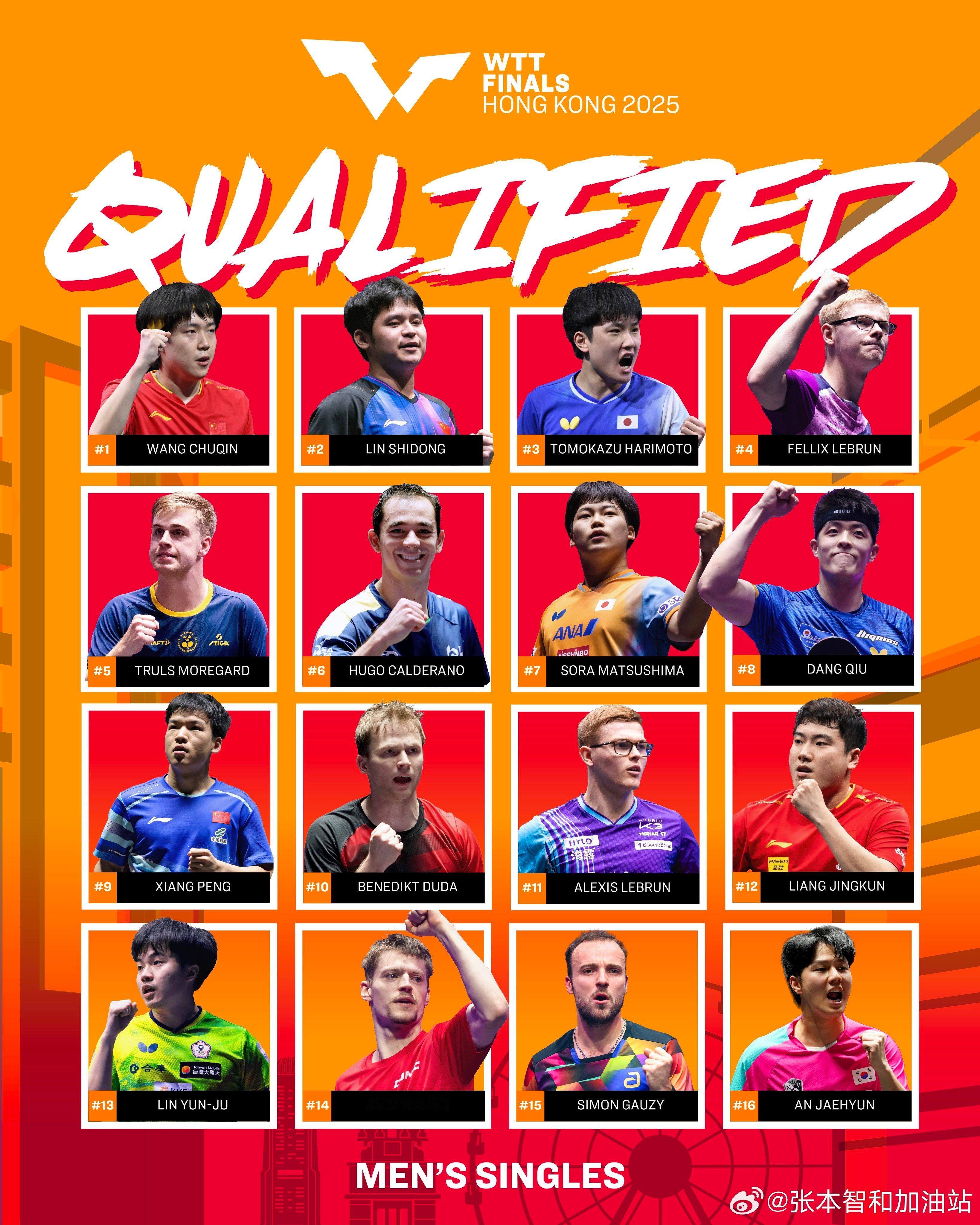 男单16人名单。“最终WTTHongKong点名📣RaceToHongKong完成后——这些乒乓球明星中,谁将在2025赛季结束时取得最佳成绩🤩” (机翻)cr:WTT