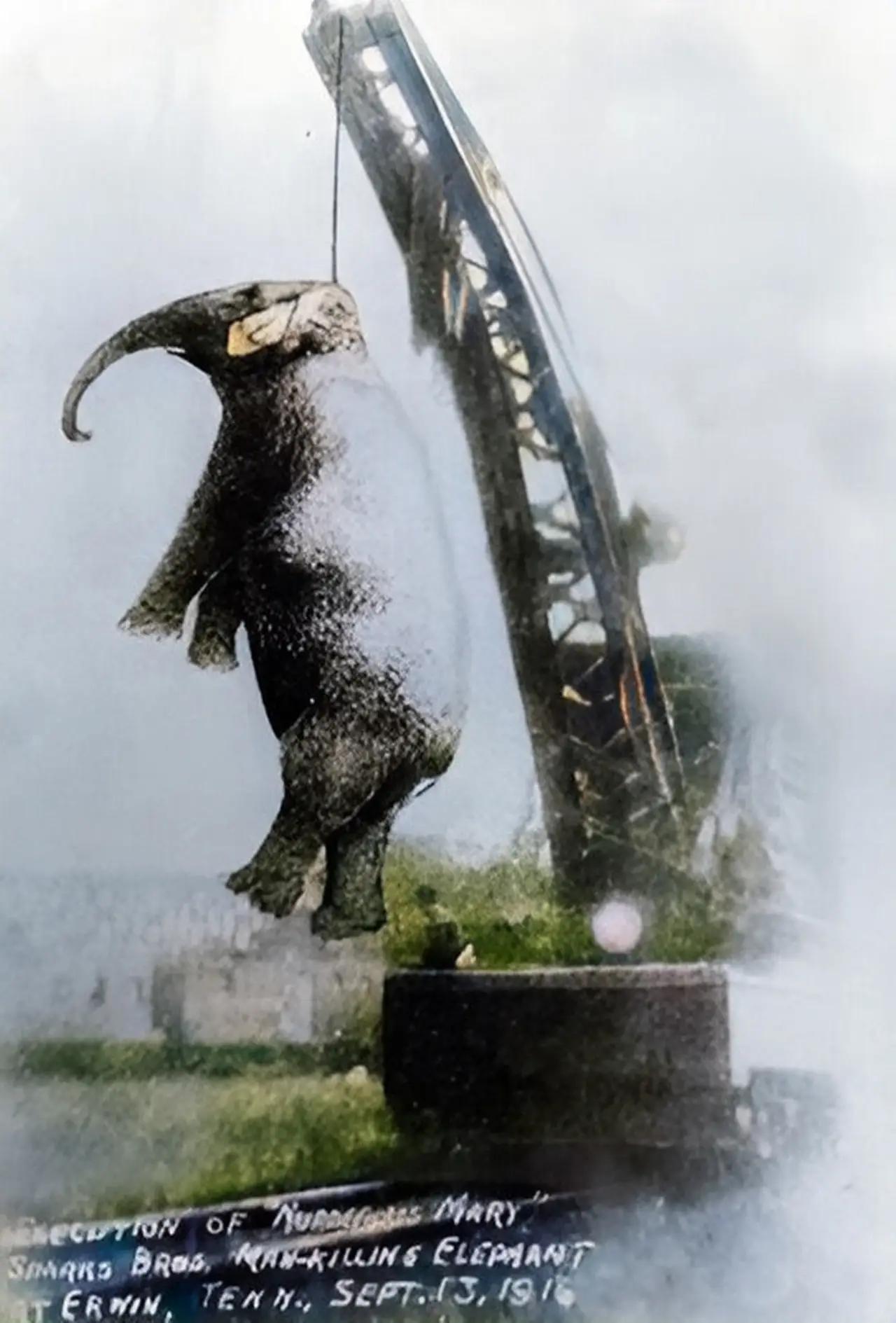 被判死刑的大象!1916年,在起重机的吊钩下,一头5吨重的美国雌性大象被缓缓吊起,大象凄惨的叫声,非但没有唤起人们的怜悯,反而让人群更加兴奋......“杀死它!杀死它!快把它给吊死!” 这成了她最后一场“演出”。 你能想象吗?一头大象被吊死的那一刻,人群不但没有落泪,反而在欢呼。 1916年9月13日,美国田纳西州,一个镇级小地方,却上演了历史上最荒唐、最血腥的“公开处决”。 大象叫玛丽,体重将近五吨。她不是罪犯,更不是怪物,却因为踩死了一个新手驯兽员,被“判了死刑”。 被吊死的那一刻,她发出撕裂般的哀嚎,而围观的两千多人,却像看好莱坞大片一样兴奋得大喊:“吊死它!” 玛丽原本是明星,但也是囚徒。她是一头亚洲象,大约出生在1894年,1898年被送到美国,加入了“斯帕克斯世界著名马戏团”。那个年代,动物表演是美国最火的娱乐之一。 玛丽是台柱子。她能演奏乐器、用鼻子投掷棒球,还能“和人互动”,是查理·斯帕克斯手下最赚钱的动物。她不只是赚钱机器,更是广告牌上的“活招牌”,被吹成“世界最聪明的大象”。 可谁关心她累不累?疼不疼?她每天都要穿州过市地巡演,吃不好、睡不稳,还得听指令。 1916年9月,斯帕克斯马戏团来到了弗吉尼亚州圣保罗镇。因为人手紧张,他们临时招了一个叫沃尔特·“雷德”·埃尔德里奇的流浪汉当驯兽助手。 这个人之前唯一的经验,是当旅馆门卫,连狗都没训过,更别说一头五吨重的大象。 他被安排在玛丽身边,手里还给了他一根带钩的棍子。这玩意儿说白了就是一种“控制工具”,在当时的马戏团常见,用来猛戳大象的耳后、眼角等敏感部位,逼它服从命令。 可没人告诉他,大象不是机器,尤其是玛丽,后来兽医检查发现她牙齿严重感染,长期疼痛很可能让她对刺激格外敏感。 那一天,马戏团正举行街头游行。玛丽看到地上有块西瓜皮,停了下来想吃。埃尔德里奇没经验,也没耐心,直接拿尖钩戳她耳后。 玛丽痛到极点,突然暴怒。她用鼻子卷起他,狠狠甩到地上,再一脚踩碎了他的头。那一刻,现场失控,人群四散奔逃,尖叫声此起彼伏。 这是玛丽第一次,也是最后一次反抗。 事情发生后,马戏团陷入危机,观众不敢再看演出,地方政府和居民要求:“不杀这头象,就别想再开演。” 查理·斯帕克斯面对巨大舆论压力,权衡之后选择“顺从民意”:公开处死玛丽。 这不是法律裁决,也不是道德审判,而是一次赤裸裸的商业决策。他怕影响门票销量,怕媒体炒作,更怕同行抢生意。于是,吊死玛丽,成了一场哗众取宠的“公关表演”。 起初,他们想用枪,但一头成年亚洲象,皮厚如盾,普通子弹根本打不穿。也有人建议用火车碾压,但操作太难,视觉冲击也不够强。 最终,他们决定用最“震撼”的方式:用铁路起重机,把玛丽活生生吊死。 田纳西州埃尔温镇,克林奇菲尔德铁路场,2500人围观。孩子、老人、女人,甚至学校都组织学生来看“吊大象”。 玛丽被铁链套着脖子吊起,可第一次吊升就失败了,链条断裂,她重重摔在地上,髋骨断裂,痛苦不堪。 第二次,他们换了更结实的链子。玛丽再次被吊起,挣扎、哀鸣、四脚乱踢,直到窒息,慢慢安静下来。 整整一个小时,这头曾为人类带来欢笑的大象,被吊死在众目睽睽之下。 她的尸体被就地掩埋,马戏团拍拍屁股走人,继续巡演。 埃尔温镇却因此背上了“吊死大象的城市”这个骂名,100多年都甩不掉。 早在1903年,纽约康尼岛就曾用电椅电死一头叫托普西的大象,还拍成电影卖票。类似事件在20世纪初美国屡见不鲜。那时候,动物不是生命,是“表演工具”,一旦失控,就得“处理掉”。 可问题从来不在动物。 玛丽之死,是一连串管理失败、伦理缺失和社会情绪失控的结果。从雇佣新手,到使用残忍工具,再到忽视医疗,再到最后的“公审”,每一步都是错误。 更讽刺的是,明明是人为失误,最后却让动物承担全部后果。 多年后,埃尔温镇的居民终于开始正视这段历史。 2016年,也就是玛丽被处决整整一百年那年,当地举办纪念活动,拍卖了玛丽雕像,把所得捐给田纳西州的大象庇护所,希望用行动为过去赎罪。 今天,动物表演在很多国家已经被严格限制。美国的多个州已禁止使用野生动物进行商业表演。中国也在加强动物保护立法,鼓励建立更多自然保护区。 人们终于意识到,动物不是娱乐工具,它们也有情绪、有疼痛、有恐惧。 玛丽用生命换来的,不是掌声,是警醒。 娱乐从来不能凌驾于生命之上,文明的底线,必须有一条叫“尊重”。