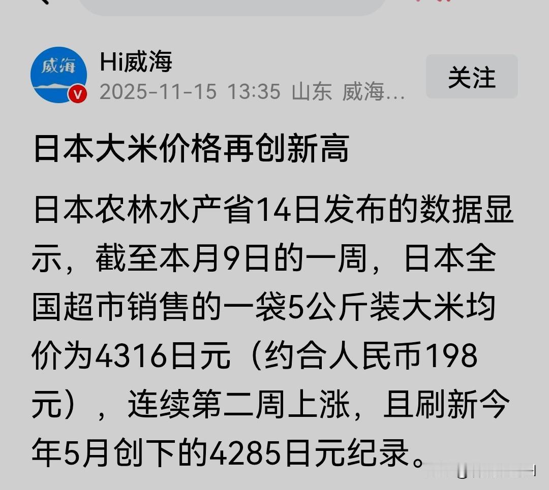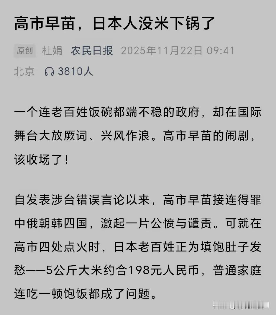 日本老百姓没米下锅了,高市早苗的闹剧该收场了! 近日,据多家媒体报道:自从日本女首相高市早苗发表涉台错误言论以来,接连得罪中、俄、朝、韩四个国家,在国际社会上激起了一片公愤与谴责! 这一边,高市早苗在国际社会四处扇风点火,可以说是举步维艰;那一边,日本国内的形势也不好,老百姓正为填饱肚子艰难活着!因为日本国内市场大米价格正在飙涨,5公斤大米已涨至4316日元(约合198元人民币)。由于日本物价上涨的无底线,他们普通家庭连吃一顿饱饭都成了问题。 也许很多网友对日本国内目前的粮荒存在质疑,认为这是一种传说。如果不相信,请大家分析一下:日本是一个岛国,四面环海,地少人多。即便有那么一点点陆地,而且火山还特别多,在这种基层条件之下,日本缺大米属于正常。如果媒体说日本大米特别多,那反而是瞎吹的! 假如这样的分析还没有说服力,我们来看看刚从日本回来的网友是怎么评论的!这位网友留言说:昨天他从日本刚刚回来,路边的日本人确实正在挨饿……路边小草都被饥肠辘辘的日本人吃光了! 归根结底,一个连自己国内老百姓饭碗都端不稳的政府,其首相却在国际舞台大放厥词、兴风作浪。高市早苗掀起外交闹剧该收场了!