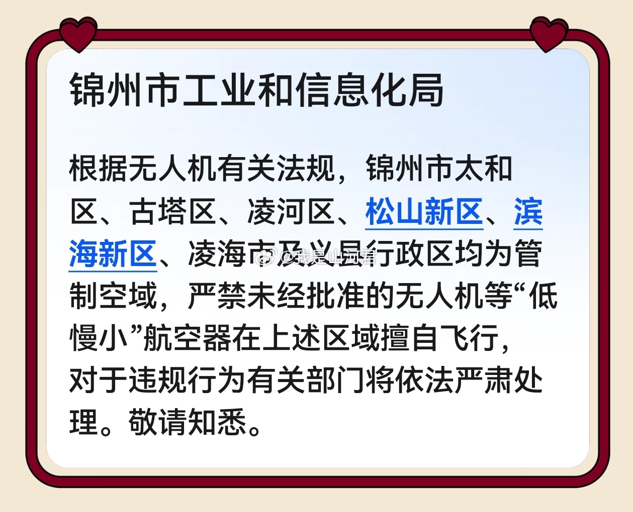 锦州飞友注意!太和区、古塔区、凌河区、松山新区、滨海新区、凌海市及义县行政区均为无人机管制空域,未经批准严禁“低慢小”航空器擅自飞行。违规飞行不仅会扰乱空域秩序,还将被有关部门依法严肃处理。请大家严格遵守法规,别心存侥幸哦!
