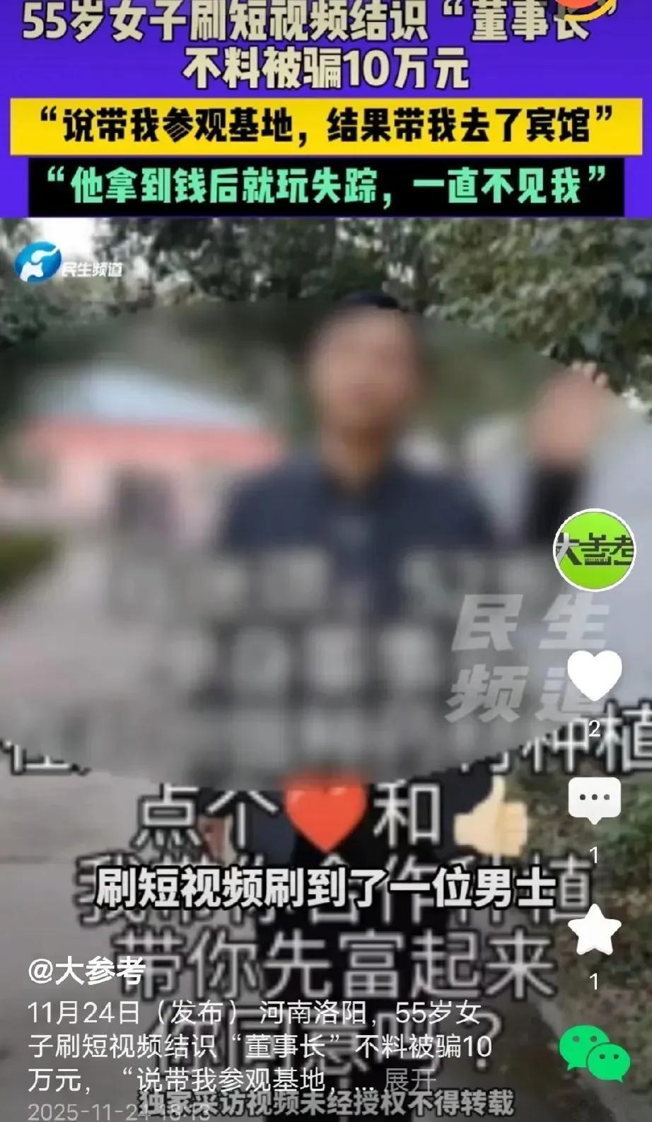 河南洛阳,55岁女子被男子骗到宾馆开房,他对女子说,我喜欢你,女子信以为真,给他转520红包,还拿300现金给他买短袖。之后男子又以“项目周转”为由,跟女子拿了10万1千元。没想到,钱一到账,男子就彻底失联。女子这才意识到被骗,哭着向媒体求助:他说他是公司董事长,穿的都是名牌,说的话那么真诚,我完全信了。 有网友说: 是个人都知道是个骗子!你五十五了,一个家产万贯的人跟你谈对象? 就这个懂事长的牌子都能让那女人魂牵梦绕四十年。这牌子是未来的生活的底气,致死无悔。 人一旦有了贪心,就容易被利益冲昏头脑,就能一条路走到黑,把别人的善意当作他发财的拌脚石。 像这种人被骗的多的去了。几句花言巧语,就能把这货骗的摸不着东南西北。 55看上帅气猛男,也想吃嫩草,结果嫩草有毒,来个上吐下泻,直接伤了元气。 拿脚后跟想想也是骗局,你一个55岁绝经女人,一个董事长去爱你而且你还动了情? 能在网上聊天,谈朋友宾馆开房的,无论男女都不是真心实意,想安安稳稳过日子的人,都抱着你骗我,我骗你的心里去的。