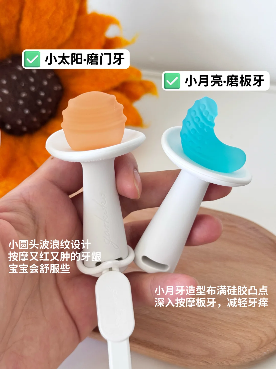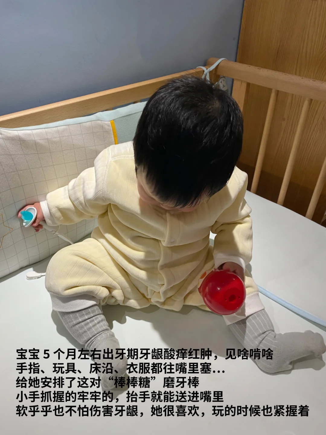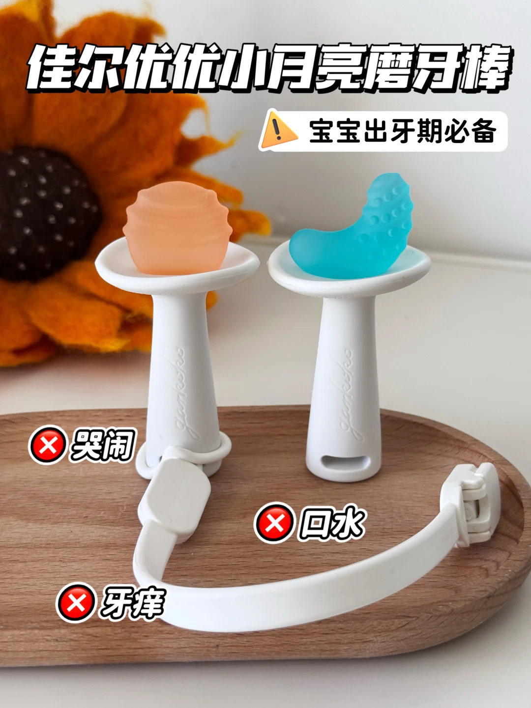 🌈宝宝0-12月龄成长三字经: 一月睡,二月闹,三抬头,四翻身, 五出牙,六辅食,七月坐,八月爬, 九断夜奶,十学语,十一站,十二走。 . 🌈1-3月 👶🏻成长进程: 追视、追听;俯卧练习抬头 咿呀发声;自发微笑;尝试翻身 ✅ 早教玩具: 黑白卡、摇铃、沙锤、彩色卡、氢气球、床铃、钢琴健身架 🌈4-6月 👶🏻成长进程: 咯咯笑出声;能抓握,替换手;掰手脚,出牙牙 会躲猫猫、会照镜子、会发出无意识bb mm ✅早教玩具: 磨牙棒、曼哈顿球、布书 像我家宝宝5个月左右就小牙牙就早早冒尖了,难怪那阵子她总是流口水啃能啃到的一切东西,自己的手、妈妈的手,还有各种玩具。真的能感受到她的酸痒难忍,牙龈磨得吱吱响。 幸好我早早给她入了这对佳尔优优小月亮磨牙棒,一组两个,门牙用这个小太阳,波浪纹造型,牙床肿胀得到很好的安抚。随着板牙逐渐一个个冒尖,用这个蓝色的小月亮,弯弯的一个,上面布满硅胶凸点,可以深入后牙,按摩牙周减轻痒痛。这对磨牙棒是奶嘴级液态硅胶一体成型的,软软QQ,不怕戳到牙龈,也没有断裂误吞的风险。而且根据宝宝的啃咬习惯,设计了贴心的加大挡板,就算宝宝吃的再投入,也不怕戳的太深引起干呕。 用防掉链夹在衣服上,宝宝啃咬瘾上来时,抓起来啃一会,舒服多了。用完清水冲洗一下就干净了,不怕藏污纳垢,省心又省妈! 🌈7-9月 👶🏻成长进程: 认人、认生、独坐、爬行、扶站 ✅早教玩具: 谷雨桌、六面体、叠叠乐、大颗粒积木 🌈10-12月 👶🏻成长进程: 独站、扶走、独立走 会说爸爸妈妈宝宝等叠词;能听懂大人的简单指令 ✅早教玩具: 洞洞书、积木、手推车、布书、球 📢注意: 不同宝宝有个体差异,总可能有不符合一些项的情况,比如我家妹妹11月龄才会爬,但是几乎爬和走是同一时期学会的,并且很快走的很顺溜! 妈妈们也不用特别焦虑,可以在家对照不同月龄的目标耐心陪伴引导宝宝。