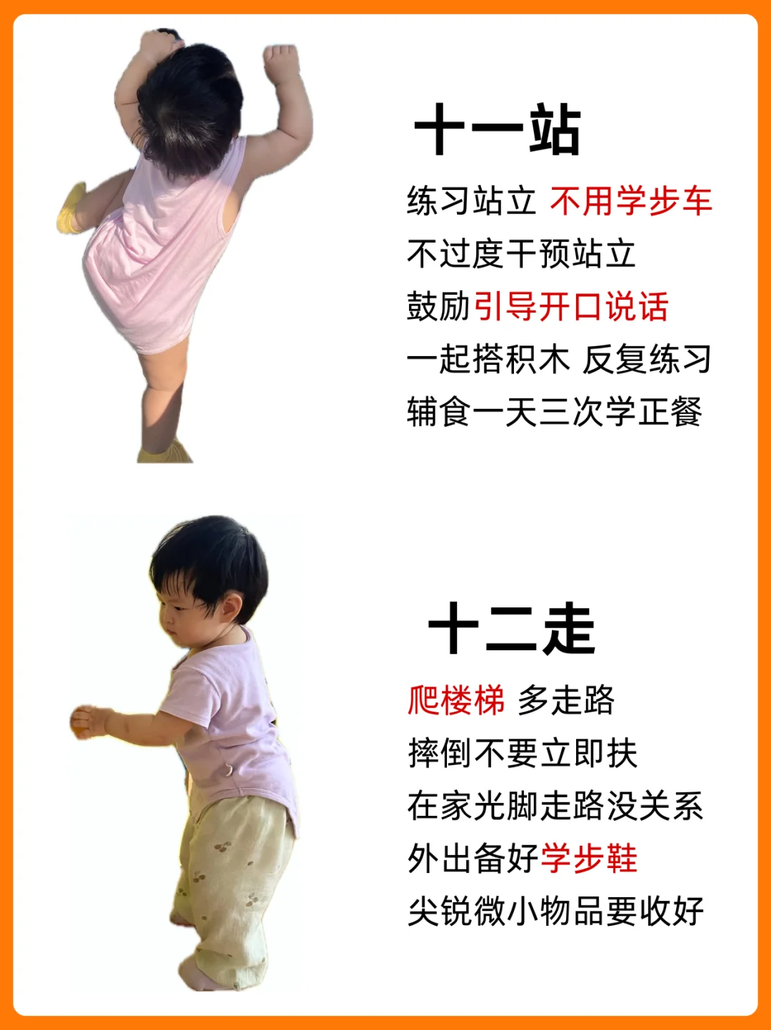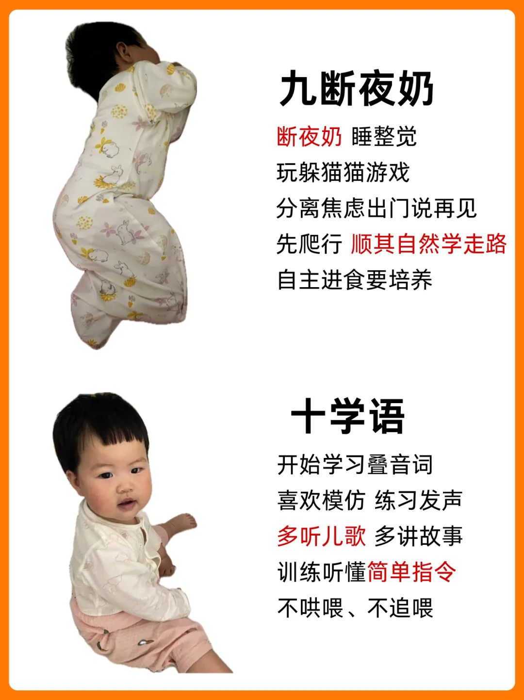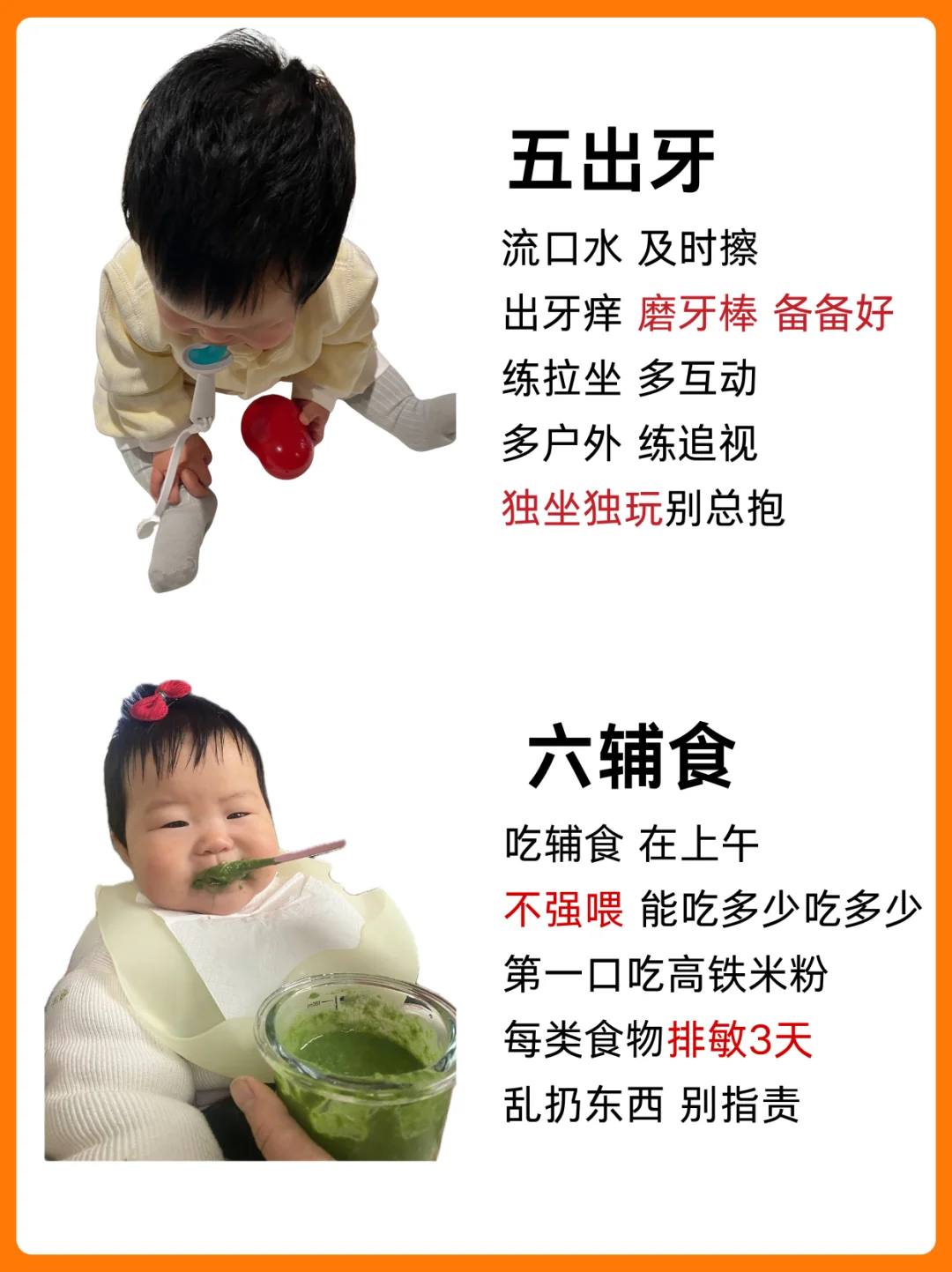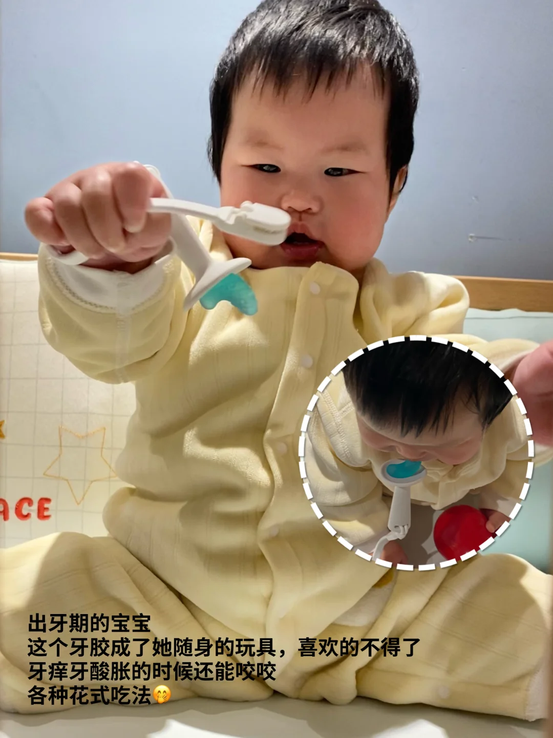 🌈宝宝0-12月龄成长三字经: 一月睡,二月闹,三抬头,四翻身, 五出牙,六辅食,七月坐,八月爬, 九断夜奶,十学语,十一站,十二走。 . 🌈1-3月 👶🏻成长进程: 追视、追听;俯卧练习抬头 咿呀发声;自发微笑;尝试翻身 ✅ 早教玩具: 黑白卡、摇铃、沙锤、彩色卡、氢气球、床铃、钢琴健身架 🌈4-6月 👶🏻成长进程: 咯咯笑出声;能抓握,替换手;掰手脚,出牙牙 会躲猫猫、会照镜子、会发出无意识bb mm ✅早教玩具: 磨牙棒、曼哈顿球、布书 像我家宝宝5个月左右就小牙牙就早早冒尖了,难怪那阵子她总是流口水啃能啃到的一切东西,自己的手、妈妈的手,还有各种玩具。真的能感受到她的酸痒难忍,牙龈磨得吱吱响。 幸好我早早给她入了这对佳尔优优小月亮磨牙棒,一组两个,门牙用这个小太阳,波浪纹造型,牙床肿胀得到很好的安抚。随着板牙逐渐一个个冒尖,用这个蓝色的小月亮,弯弯的一个,上面布满硅胶凸点,可以深入后牙,按摩牙周减轻痒痛。这对磨牙棒是奶嘴级液态硅胶一体成型的,软软QQ,不怕戳到牙龈,也没有断裂误吞的风险。而且根据宝宝的啃咬习惯,设计了贴心的加大挡板,就算宝宝吃的再投入,也不怕戳的太深引起干呕。 用防掉链夹在衣服上,宝宝啃咬瘾上来时,抓起来啃一会,舒服多了。用完清水冲洗一下就干净了,不怕藏污纳垢,省心又省妈! 🌈7-9月 👶🏻成长进程: 认人、认生、独坐、爬行、扶站 ✅早教玩具: 谷雨桌、六面体、叠叠乐、大颗粒积木 🌈10-12月 👶🏻成长进程: 独站、扶走、独立走 会说爸爸妈妈宝宝等叠词;能听懂大人的简单指令 ✅早教玩具: 洞洞书、积木、手推车、布书、球 📢注意: 不同宝宝有个体差异,总可能有不符合一些项的情况,比如我家妹妹11月龄才会爬,但是几乎爬和走是同一时期学会的,并且很快走的很顺溜! 妈妈们也不用特别焦虑,可以在家对照不同月龄的目标耐心陪伴引导宝宝。
