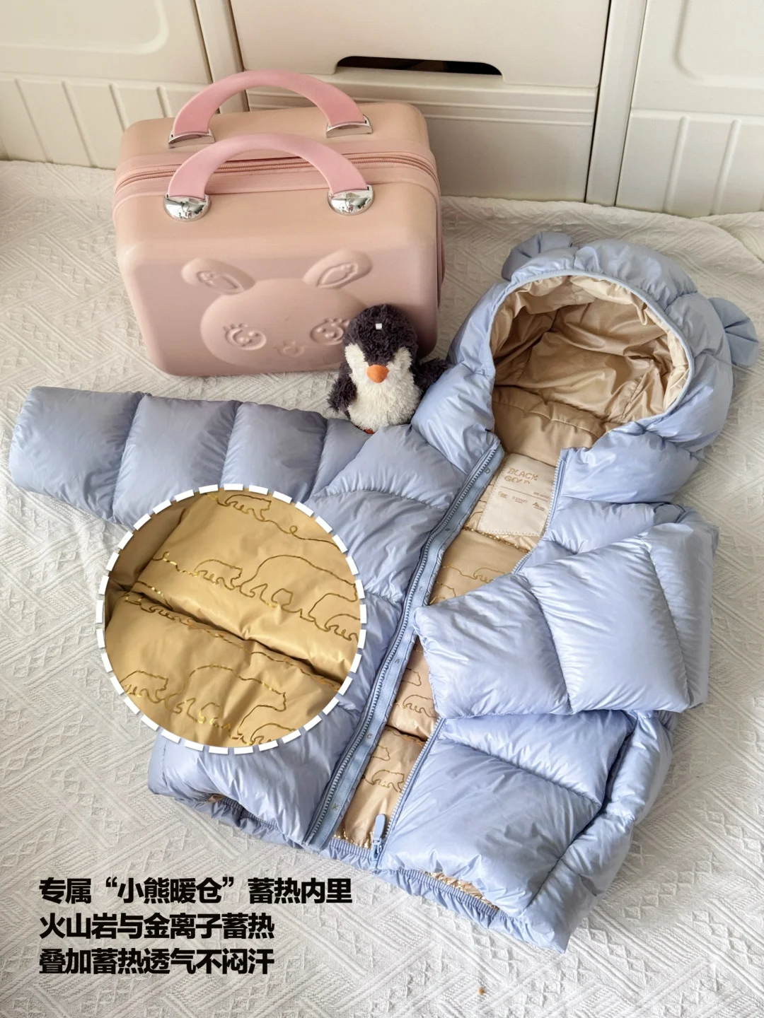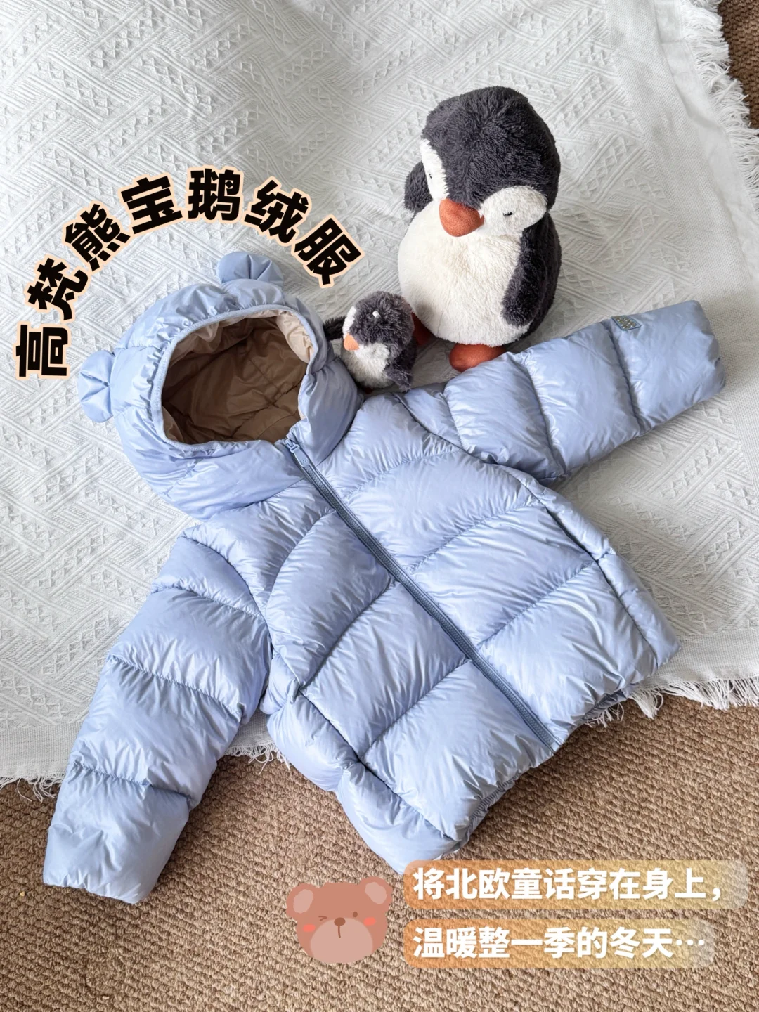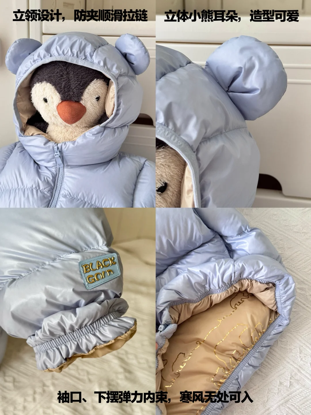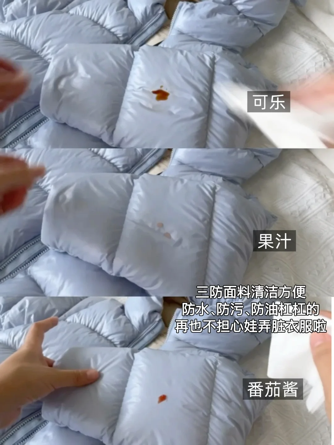 另外面料和款式也很重要。像这次做足功课后给宝宝入手的这件高梵熊宝鹅绒服,三防面料,防水、防油、防污,南方的冬天雨说下就下,不小心淋了雨也不担心,防水不渗漏,拿纸擦一下就好了!