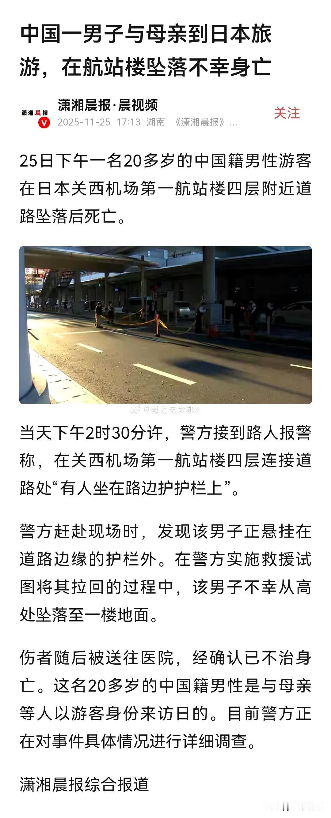 中国游客在日本关西机场坠亡!是一名20多岁的中国籍男性游客跟母亲到日本旅游,结果在日本关西机场的航站楼发生不幸了,目前具体细节还未知!其实每年发生很多中国游客和旅日的华人在日本被伤害的事件,只是国内很多新闻学是报道而已,前几个月还有几个台湾人在日本街头被无故袭击,好像嫌犯才刚刚抓到,但是那些平时很关心日本人在华的情的大V和新闻学,一般对中国人在日本出什么事,基本不报道的,但是如果有日本人在中国出现什么情况,那些大V和新闻学就会冲出来疯狂地报道,然后指责大家反日,甚至还有些会去现场送花,配合日本人各种作秀!