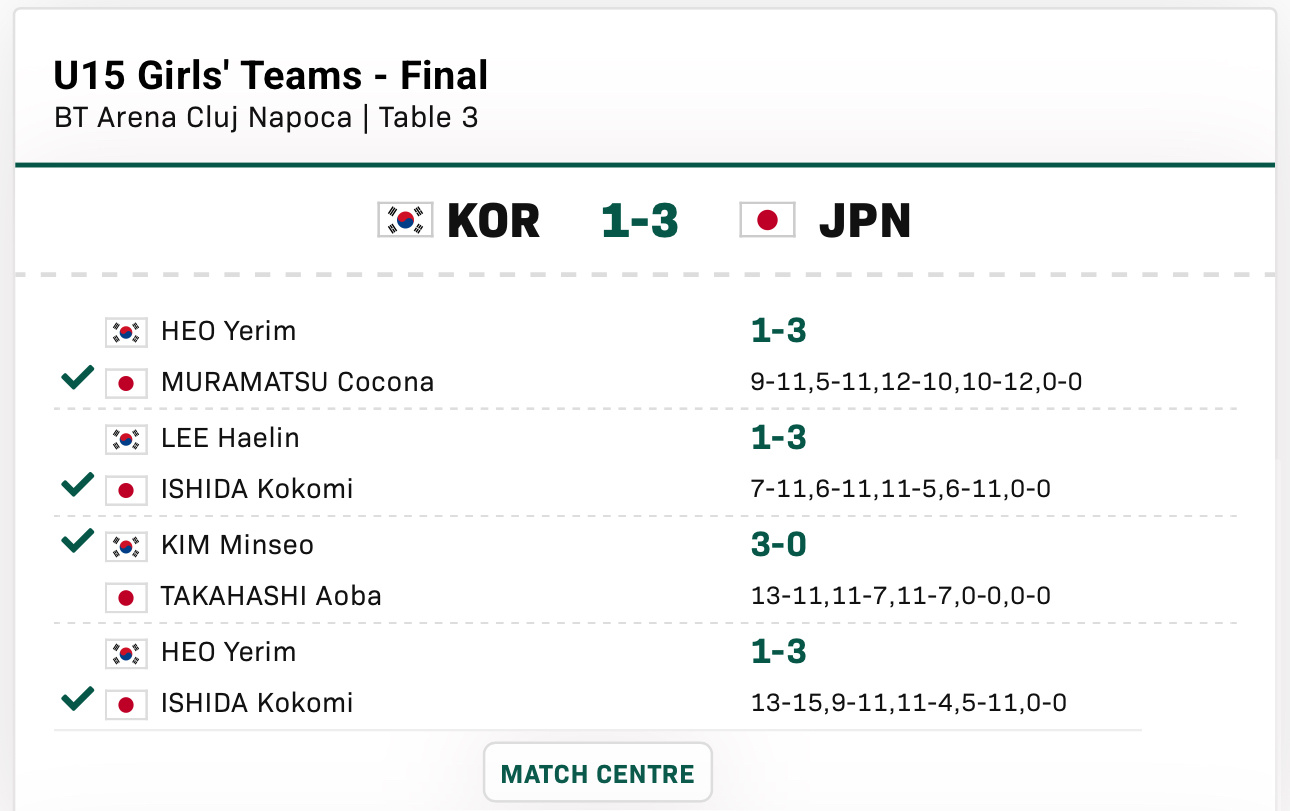 2025世青赛U15女团决赛韩国1-3日本许玴玪1-3村松心菜李海林1-3石田心美金明秀3-0高桥青叶许玴玪1-3石田心美 日本U15女团今年斩获亚青赛 世青赛双冠