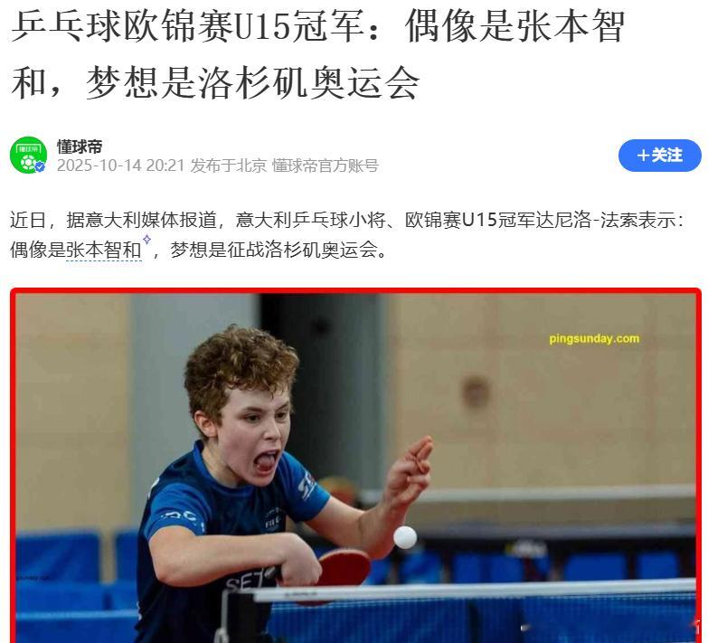 前几天的青少年世乒赛U15男团比赛中,意大利队战胜了中国队;队员之一的达尼洛·法索(Danilo FASO)曾说过,他的偶像是 。
