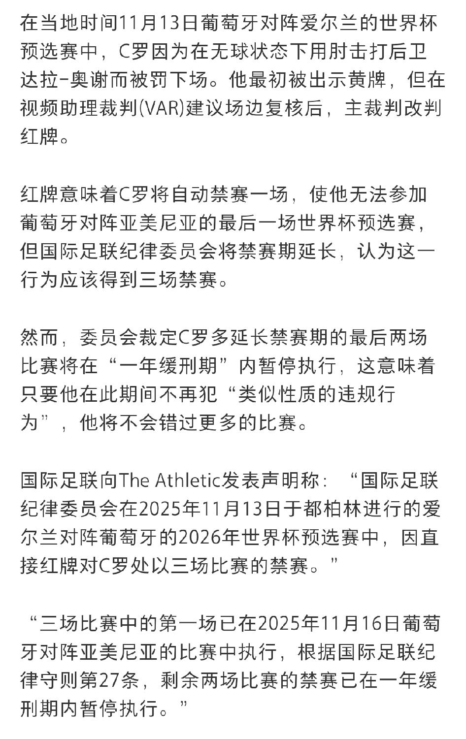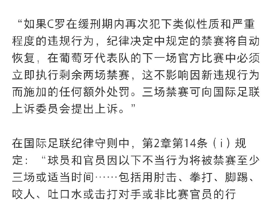 C罗红牌停赛,缓期一年执行。 国际足联还是很给我罗面子的,毕竟C罗如果缺席世界杯,是世界杯的巨大损失,哪怕缺席一场,也是不可承受之重。 这个判罚基本相当于停赛不用执行了,因为以C罗的自制力,在接下来一年在国家队比赛中不可能再拿红牌了。 现在最开心的估计是葡萄牙主教练了,不用为排兵布阵发愁了。