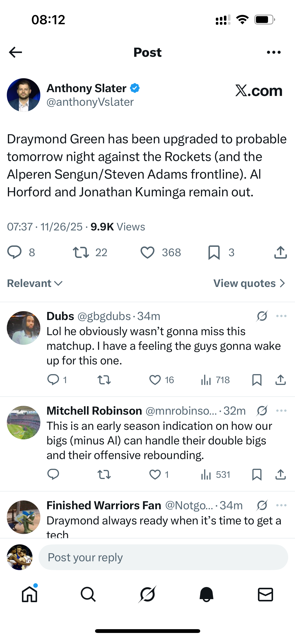 明天打火箭的比赛追梦状态升级为大概率出战,库明加和霍福德依旧缺席