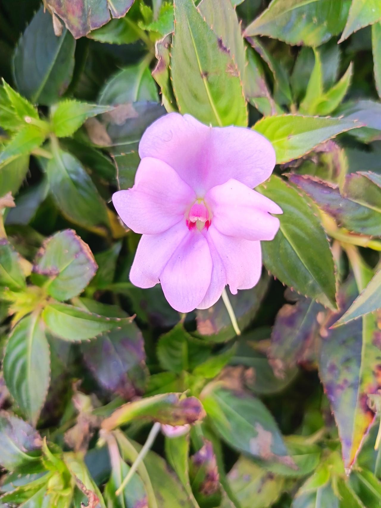 天气暖和,吃过午饭,闲来无事在附近公园散步,我漫不经心地踩在树荫里,忽然被叶丛里的一抹粉紫绊住脚步。 是朵怯生生的小花,五片花瓣晕着淡紫的雾,花心那点玫红像谁偷偷点的朱砂,细蕊垂着,沾了点午后的潮气。周围的叶带了秋的倦意,褐色斑点是季节的信笺,却偏偏衬得这花鲜活——像把夏末的软糖融在了花瓣里。 它就蜷在叶隙里开得认真,连风过都只轻轻颤一下,像在说:“你看呀,秋天也藏着小惊喜。”脚步慢下来的瞬间,连时光都软了几分。秋日午后的温柔 晨光里的花香