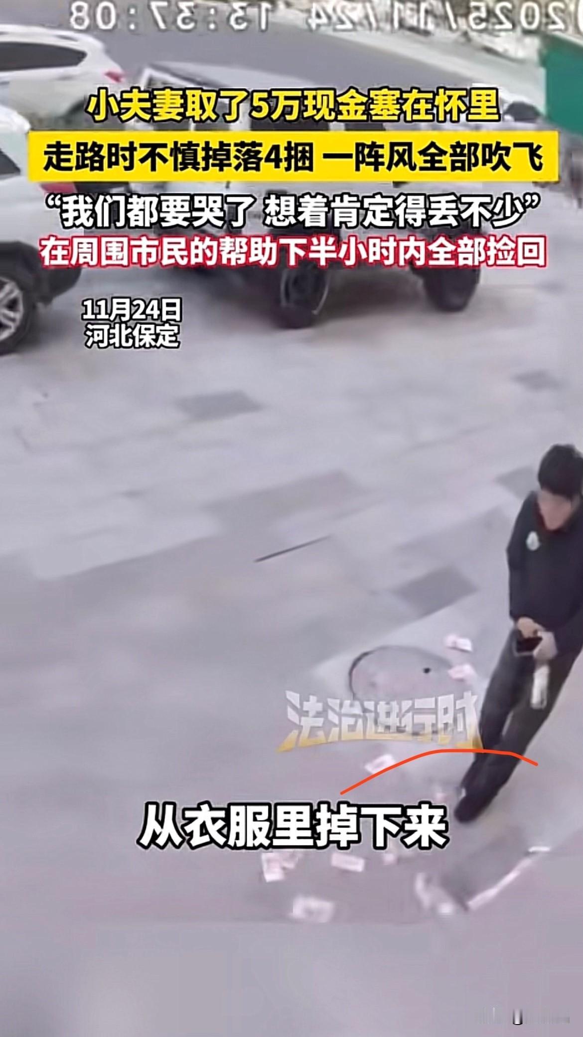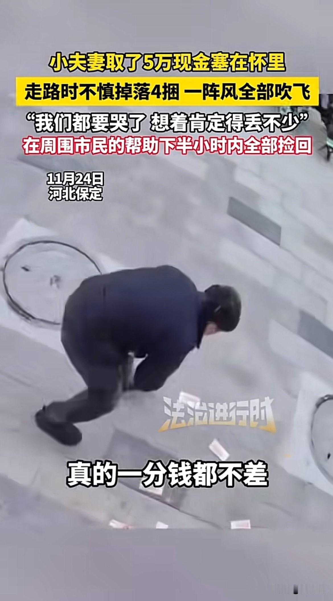 还是好人多!男子取款5万现金,不慎被风吹散,估摸会损失个万把块,没想到一分不少。 河北保定一对夫妻刚从银行取款5万现金,随手把钱揣在怀里,回家路上走动之际,4捆钱滑落在地上,刚好一阵大风,钱全被吹散,又吹到50米开外的医院门口,远的吹到数百米去。 徐先生被这意外也吓懵了,反应过来之后,连忙弯腰追着钱捡,路人纷纷帮忙。徐先生已经做好钱丢失的心理准备了,猜测肯定会损失一万八千的,等路人帮忙捡回来,结果一数,一分不少。 徐先生事后买了东西,感谢路人。妻子蹲在地上,感动哭了。感慨路人拾金不昧,好人多。 路人主动帮忙,拾金不昧,值得赞扬!徐先生知恩图报,买东西感谢大家,可谓善良的双向奔赴。 图源:法治进行时