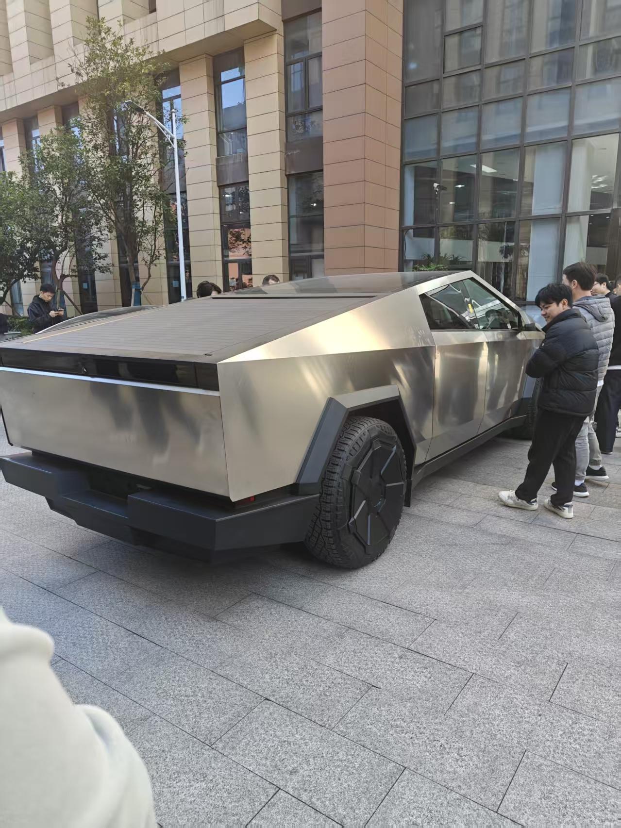 在园区终于看到特斯赛博拉皮卡了,赛博朋克科技感拉满,看的人也很多。 还没上牌,估计不是销售版本,但是这家伙真硬核,有棱有角的,不锈钢钢板都那么厚,没有上漆水,什么刮蹭也不怕了。 但是内饰方面真的一言难尽,太简约硬核了,直男风格,彩电冰箱大沙发都没有,大量塑料暴露,纯纯的工具属性,主要讲究一个耐用。 总体来讲这辆车还是非常硬核的,但是国内目前还没有开售,进口的价格在200个左右,现在在国内还是少部有钱人的玩具,还不具备正式上路的资格。 这样一辆硬核的皮卡你喜欢吗?如果上市你觉得多少钱比较合适?【来自懂车帝车友圈】