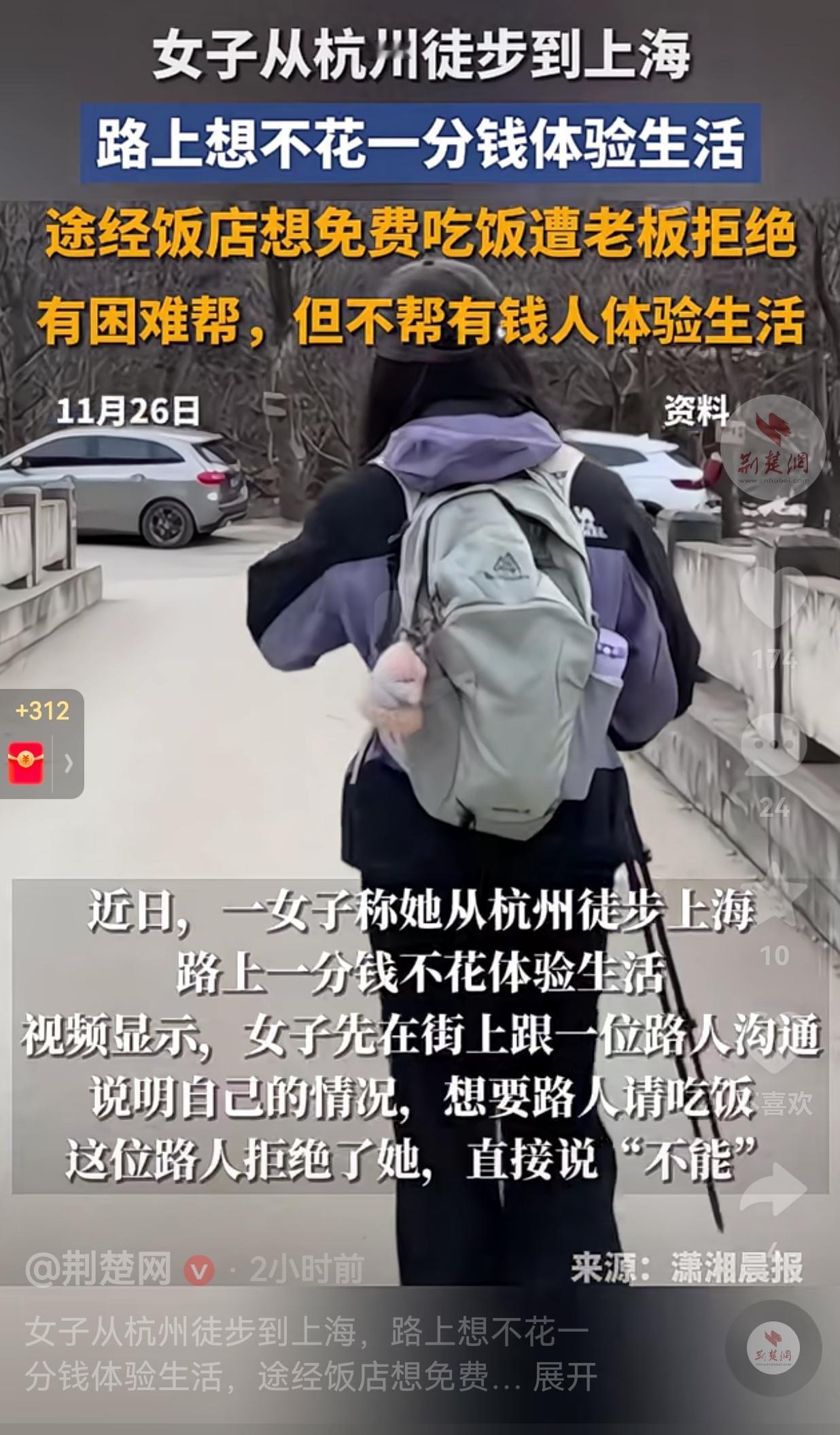 还能这样玩吗?11月26日,一女子从杭州徒步到上海,路上想不花一分钱体验生活,视频中,女子在街上跟一位路人沟通,说明自己的情况,想让路人请她免费吃一顿饭,这位路人直接拒绝了她,直接说“不能”。 走着走着,她途经一家饭店,走进了饭店,跟老板娘说明来意,让老板娘免费请她吃一顿饭,被老板娘狠狠地教育了一番。 老板娘说:“你们这些有钱人,还来体验生活,一顿饭钱都舍不得给。如果你遇到困难了,我可以帮助你,但是,我不会帮助有钱人体验生活。” 听到老板娘的一番话,女子尴尬地离开了饭店。 网友看到后评论说,你可以体验生活,但是,你打着体验生活的幌子,想一路白嫖,这种思想本来就是错误的。 还有的网友说,老板娘说得一点没毛病,人家愿意帮助需要帮助的人,不会帮助有钱人体验生活。 帮助他人是雪中送炭,而不是锦上添花。老板娘有自己的底线,她愿意献出爱心,帮助需要帮助的人。可是,她不会没有底线给予帮助。 试想一下,如果所有的人都打着需要帮助的幌子,免费蹭吃蹭喝人家做生意也是为了养家糊口,你让人家还怎么生活呢? 我也奉劝一些有钱人,你可以体验生活,因为你不需要打工,你不缺这一星半点。但是,你不能为富不仁,以牺牲别人的利益为前提,一路招摇撞骗,蹭免费的午餐。 大家觉得呢?欢迎大家评论区讨论留言。