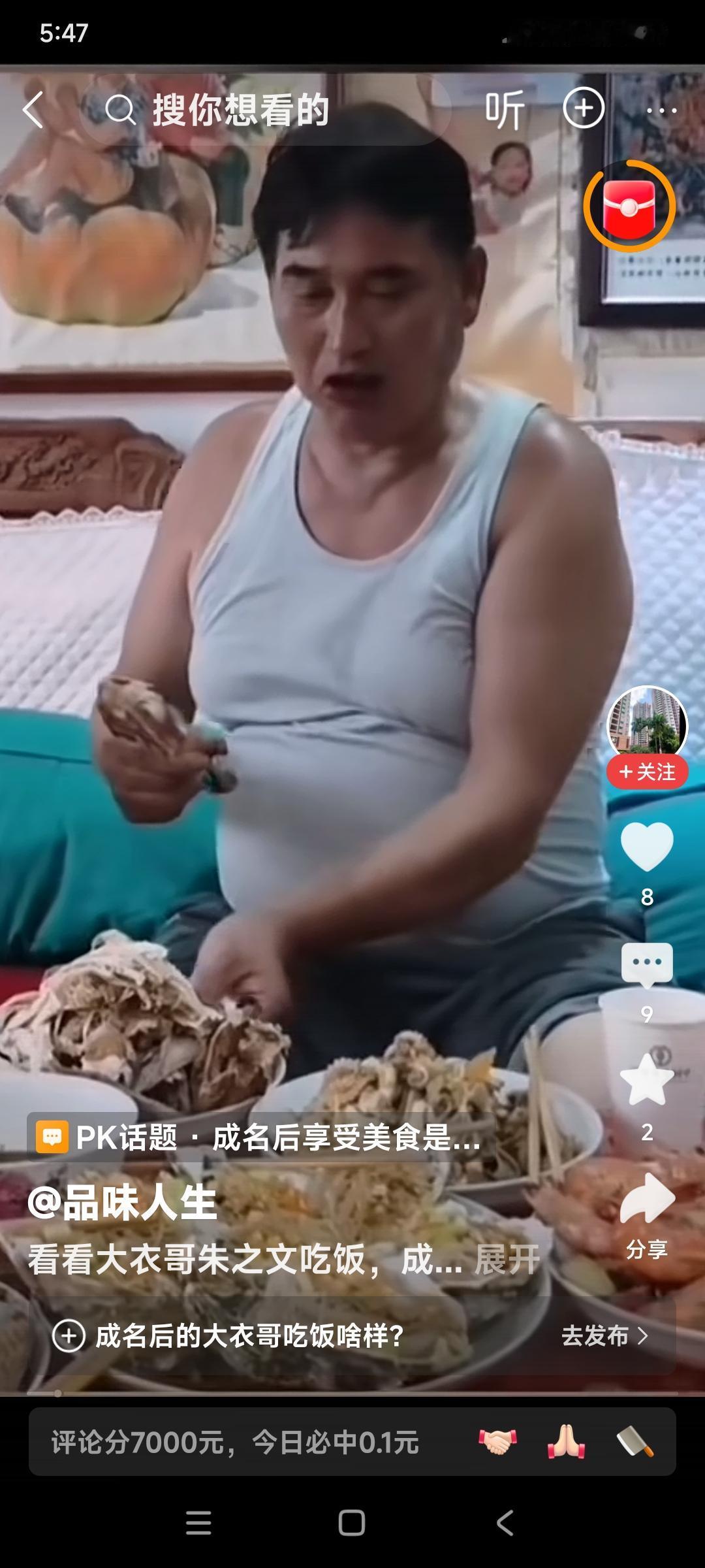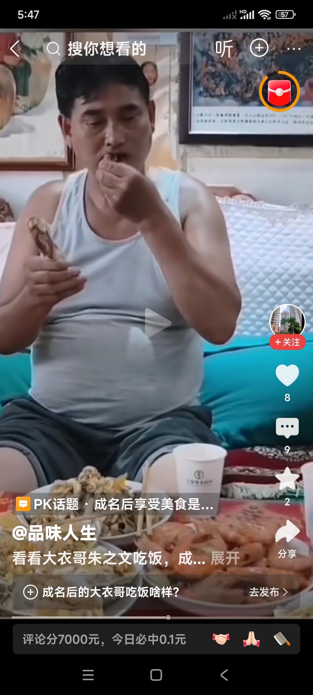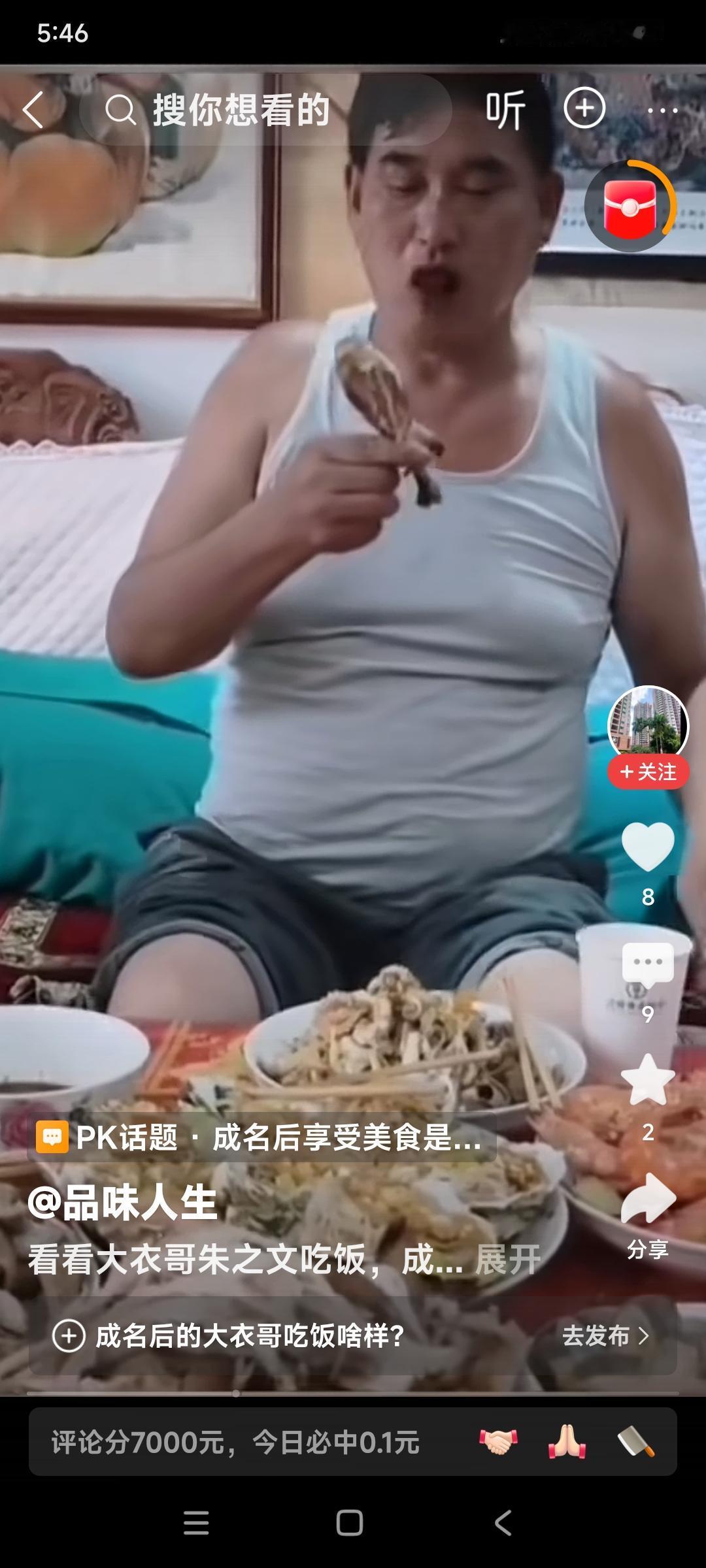 朱之文挺个大肚子又吃上了。 现代版的地主家生活儿就是好。 这是在吃鸡腿吧,两个手忙活不过来,往嘴里塞。 满满一桌子菜,全是大盘子,别的没看出来,大虾有一盘儿吧。 是不是一定要有海参? 别的不说,海鲜菜肴肯定有。 你们说这是不是地主家的奢侈生活。