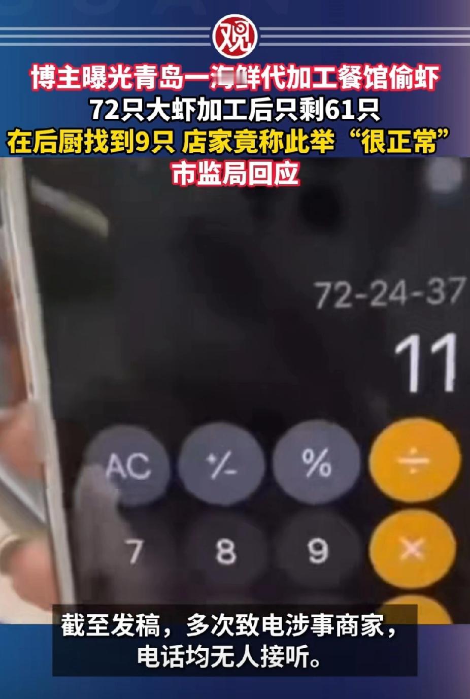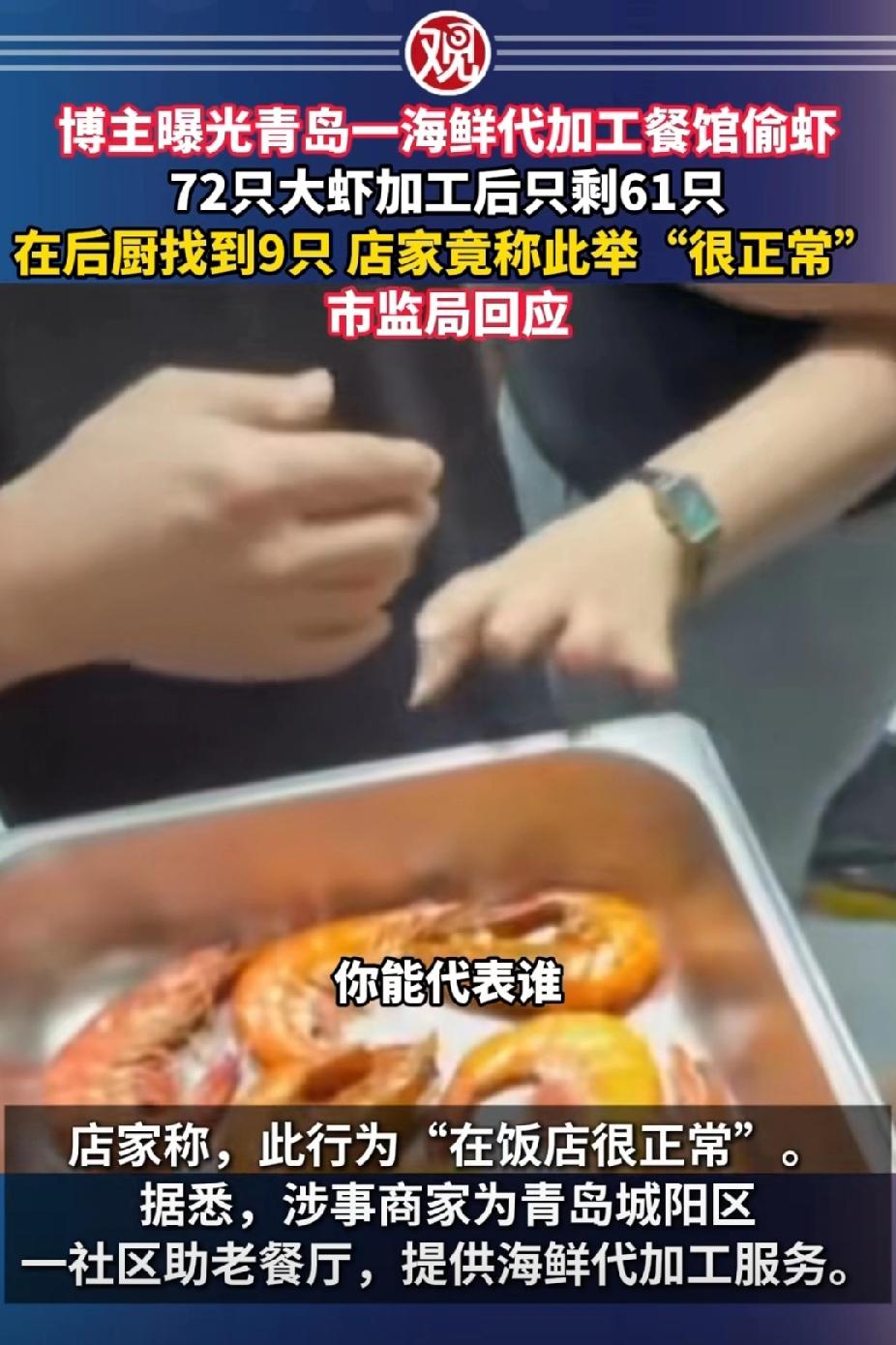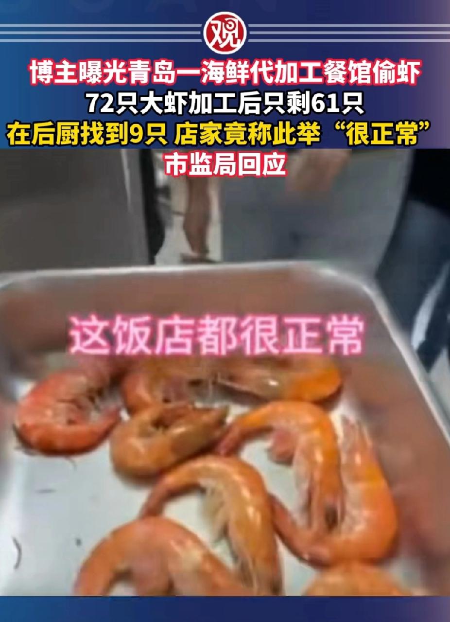 青岛跟大虾过不去了这是。一博主在青岛某海鲜代加工餐馆加工了72只大虾,拿到后发现只剩61只,随后在后厨找到了缺少的9只,餐馆负责人竟称“饭店都这么干,很正常”。博主接受不了,投诉至市监局,市监局对涉事商家已立案调查,称后续将会公布处罚结果。, 太不长记性了,青岛上一次因为天价大虾挂热搜多少年,时不时被人拎出来嘲笑,如今因为私留大虾又挂热搜,青岛离海边那么近,缺大虾吗?游客来一次不容易,给人留个好印象不行吗?青岛文旅出来干活了!